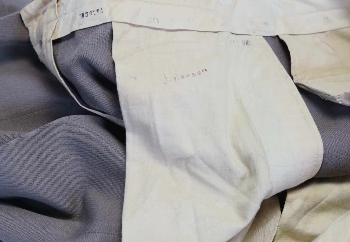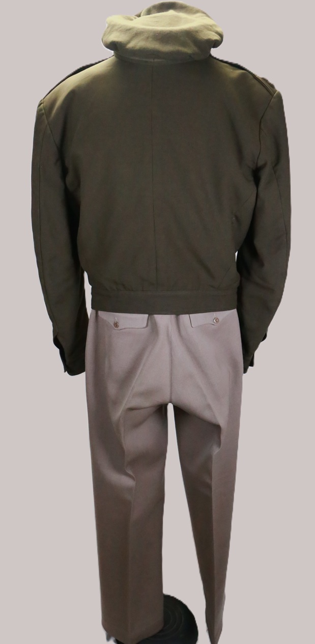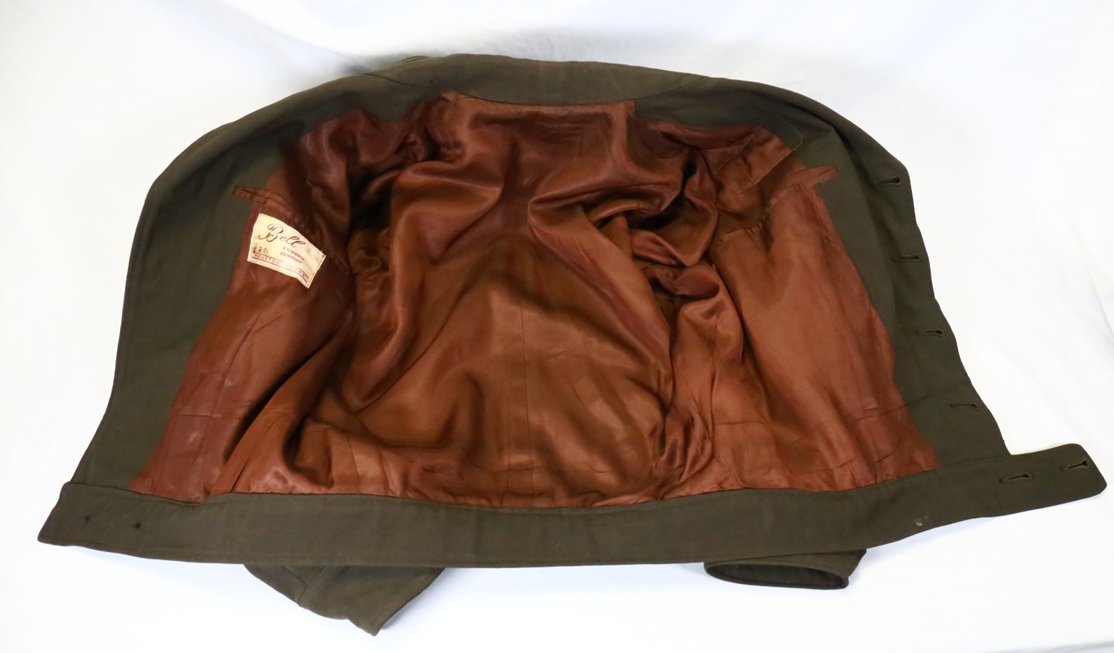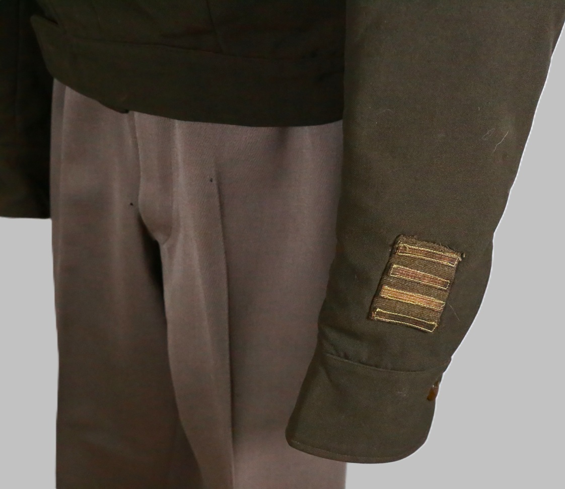 This is the well-named pinks and greens and crusher cap of Captain Jack Watson, 358th Bomb Squadron, 303 Bomb Group, 8th Air Force.  Watson is credited with 31 missions as crew or pilot of B-17’s including Hel’en Hiwater, Meat Hound and Wanton Woman.  The group consists of his named Ike jacket with lead pilot blue wing background, bullion Captain rank and US and Air Corps insignia, also has Presidential unit citation. Left sleeve has English made Air Corps patch and 4 overseas stripes in gold lace.  Matching shirt and pants are in very good condition with shirt having basic Air Corps patch on left sleeve. Shirt is missing 1 button.  Pants are clearly named, shirt is not named but matches pants. Crusher cap is of very high quality and is marked by military outfitter on sweatband.  The jacket and hat show age and wear from period use but remain in very good condition.  This group came from an older collector that had purchased it from the family many years ago.