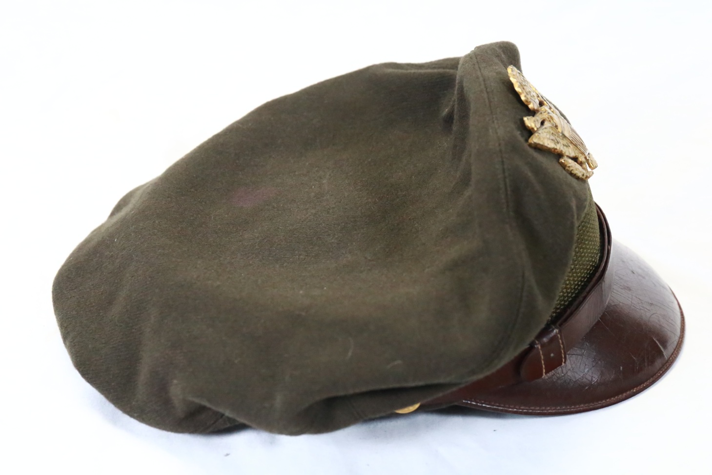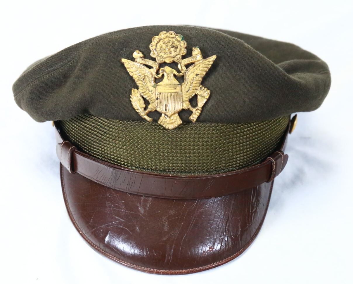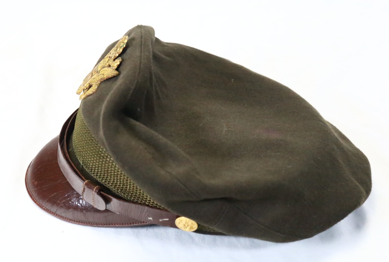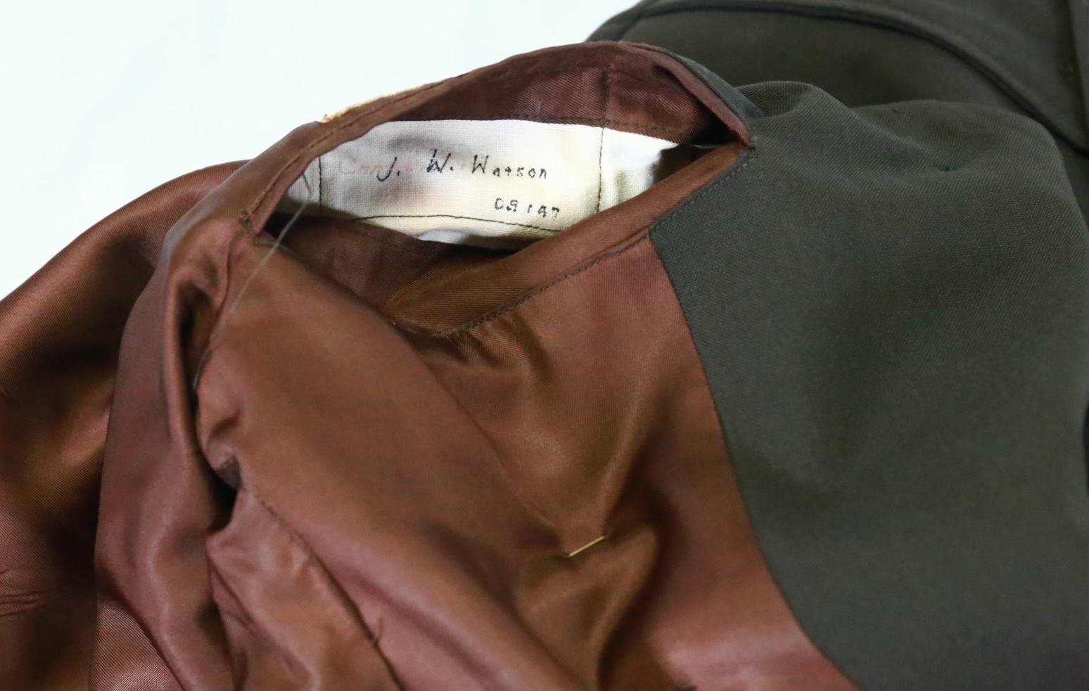 This is the well-named pinks and greens and crusher cap of Captain Jack Watson, 358th Bomb Squadron, 303 Bomb Group, 8th Air Force.  Watson is credited with 31 missions as crew or pilot of B-17’s including Hel’en Hiwater, Meat Hound and Wanton Woman.  The group consists of his named Ike jacket with lead pilot blue wing background, bullion Captain rank and US and Air Corps insignia, also has Presidential unit citation. Left sleeve has English made Air Corps patch and 4 overseas stripes in gold lace.  Matching shirt and pants are in very good condition with shirt having basic Air Corps patch on left sleeve. Shirt is missing 1 button.  Pants are clearly named, shirt is not named but matches pants. Crusher cap is of very high quality and is marked by military outfitter on sweatband.  The jacket and hat show age and wear from period use but remain in very good condition.  This group came from an older collector that had purchased it from the family many years ago.