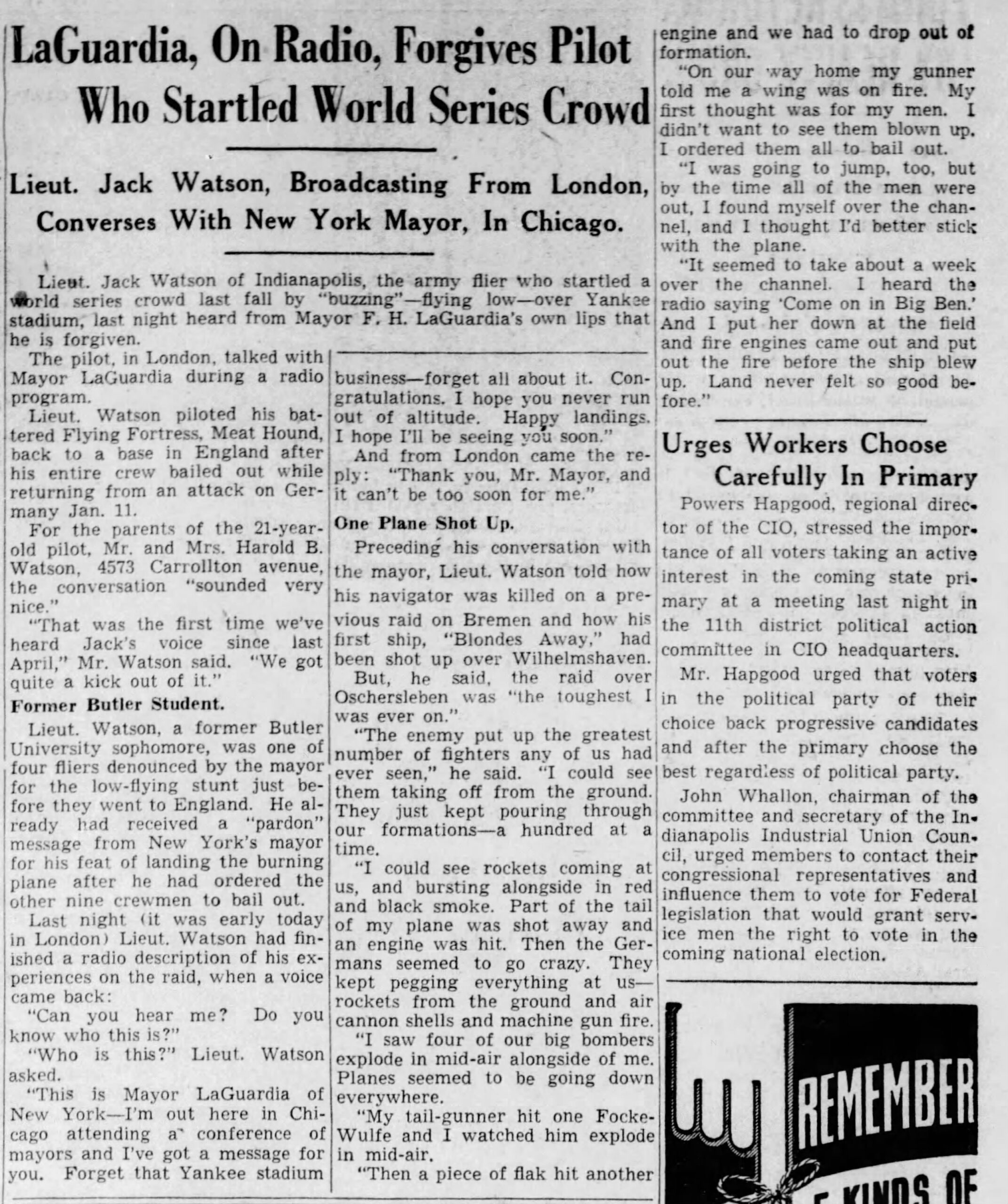 After training and upon reaching the New York City area on their way to Bangor, Maine, the crews remembered that the opening game of the 1943 World Series, New York Yankees vs St. Louis Cardinals was being played at Yankee Stadium. The four crews then decided to buzz Yankee Stadium led by 2nd Lt Watson. The low-level buzzing incurred the wrath of New York City Mayor Fiorello H. LaGuardia who demanded that the Pilots be grounded and subjected to a court-martial. Due to their training and essential knowledge, they were questioned at Bangor, Maine with no grounding but fines of several hundred dollars were levied.