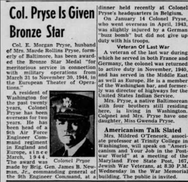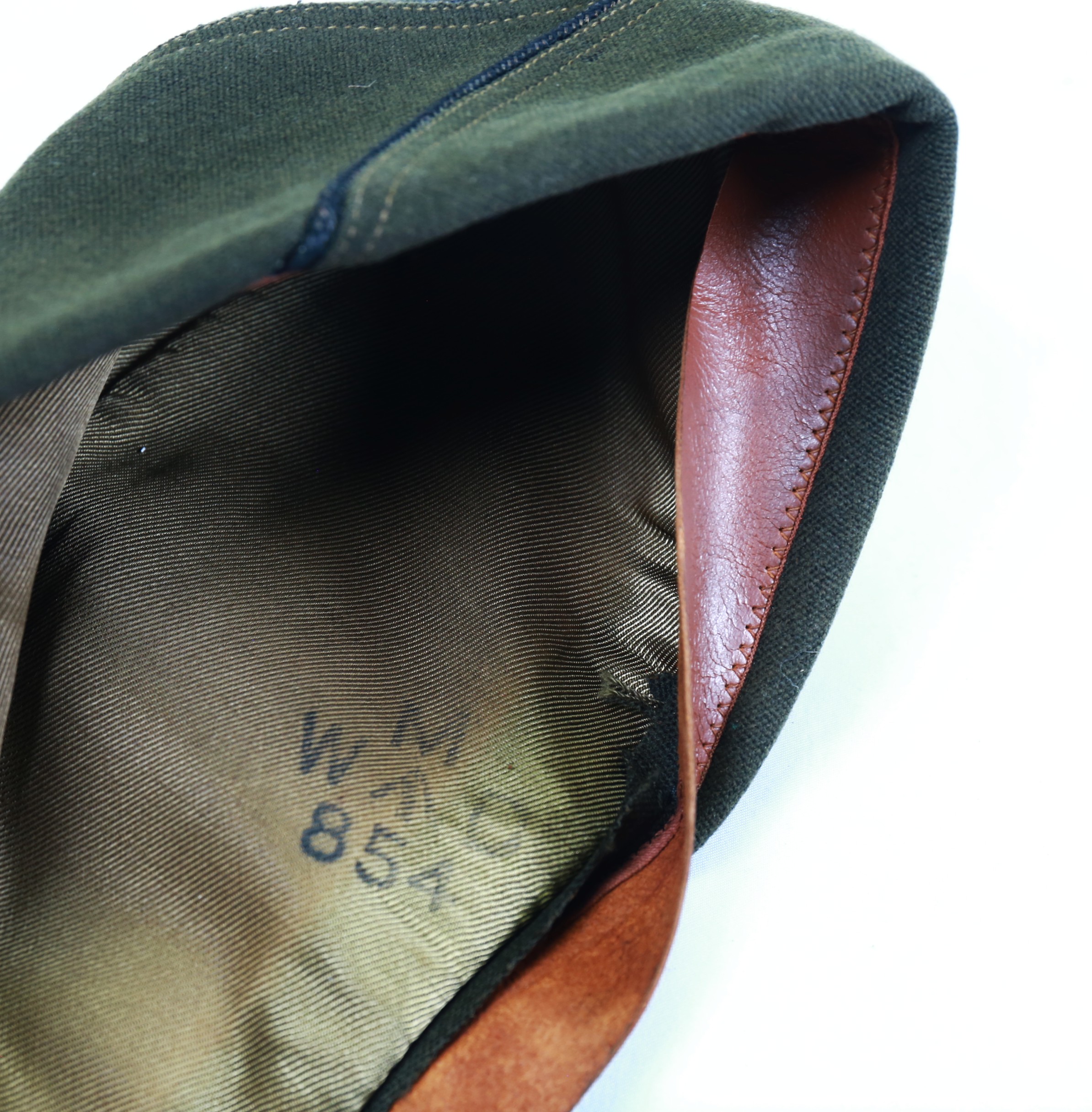 This is a pair of US Army Officer’s overseas caps both named to Colonel Elias Morgan Price. One of the caps is an English made version with pinback Colonel rank insignia. Written in ink on the sweatband is “Col Pryse”. The sweatband is impressed with English makers name and interior liner has War Department stamp. The other cap is the standard officer’s cap with black and gold soutache. Sweatband has “E M Pryse” written in ink. Pryse was the commander of the 924th engineer aviation regiment, a frontline unit during the European campaign.