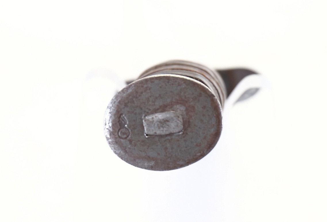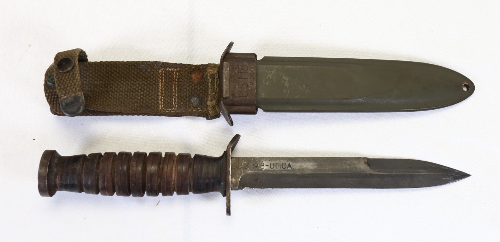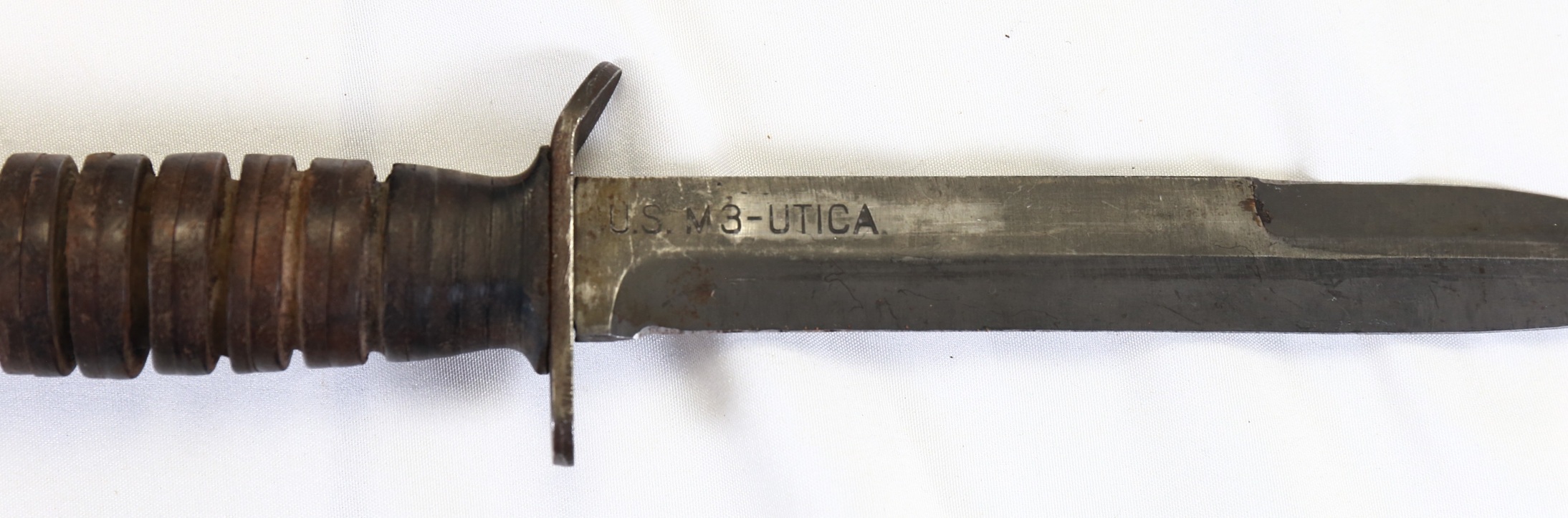 This is a very good condition blade marked UTICA M3 fighting knife with M8 scabbard. This example has the 8- groove leather grip. Staked pommel has Ordnance Bomb stamping. The blade has a medium gray parkerized finish and is marked “U.S. M3 – UTICA”. Correct short belt loop M8 scabbard without metal belt hanger, marked “U S M 8 / B.M. CO.” which is Beckwith Mfg. Co. Utica was a prime manufacturer with production of 656,620 M3’s produced.