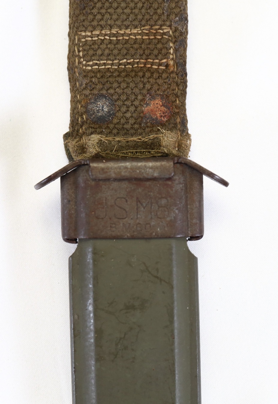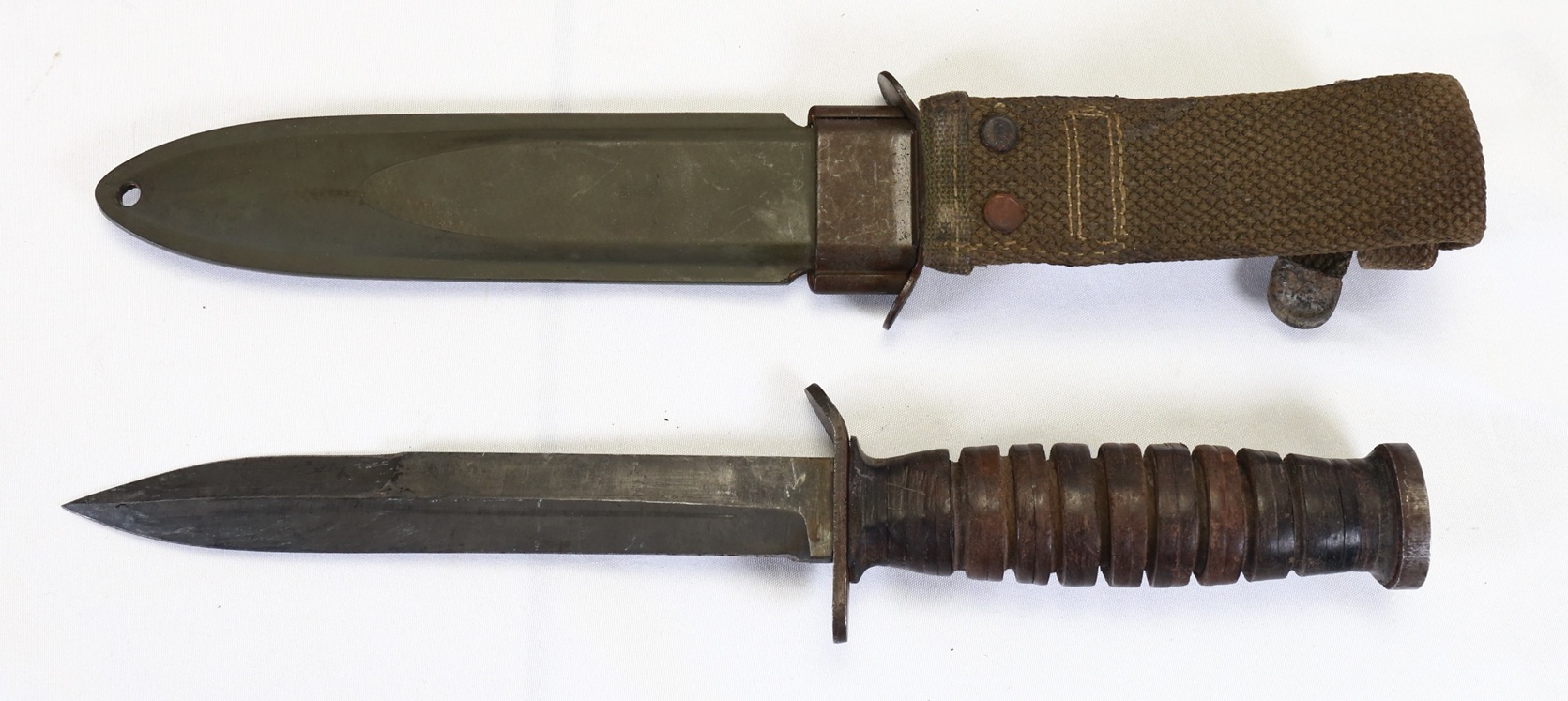 Condition is overall very good. Blade retains much of the original medium gray parkerized finish with only high point scabbard drag wear. Grip is very good just showing expected age and light use wear. The factory sharpening line is visible to edge of blade. Scabbard is very nice with nearly 100% origianl OD paint remaining. Belt loop shows some age and wear but no damage.