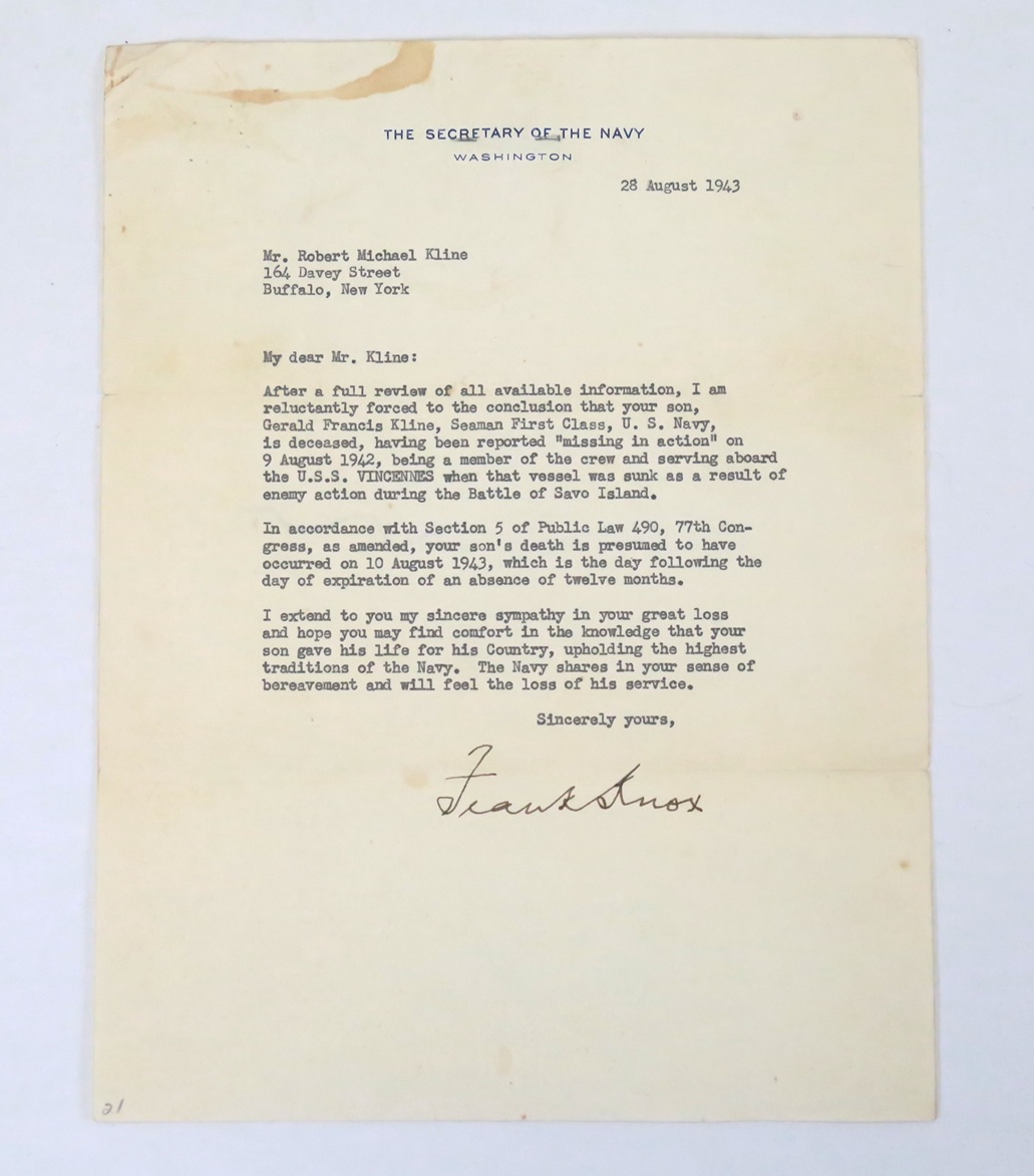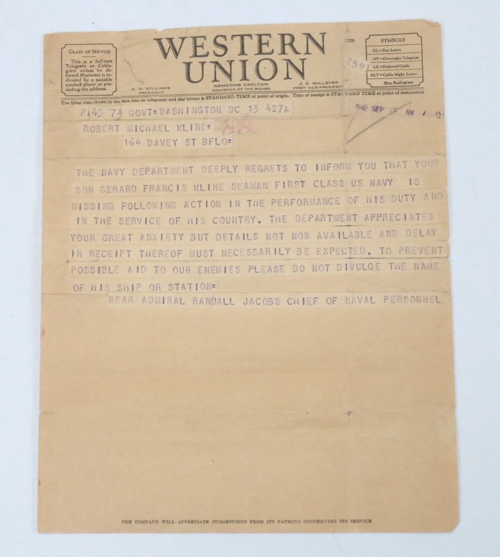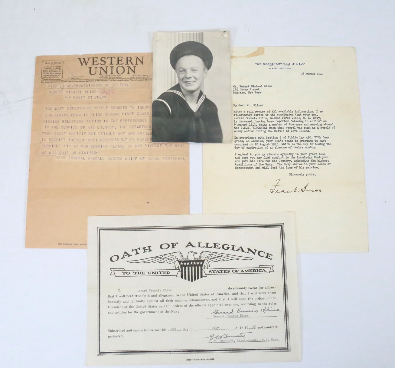 Included in this group is an original photo of Kline, the telegram to his parents, a letter confirming his death from Frank Knox, Secretary of the Navy and his Oath of Allegiance from the time he joined the Navy.