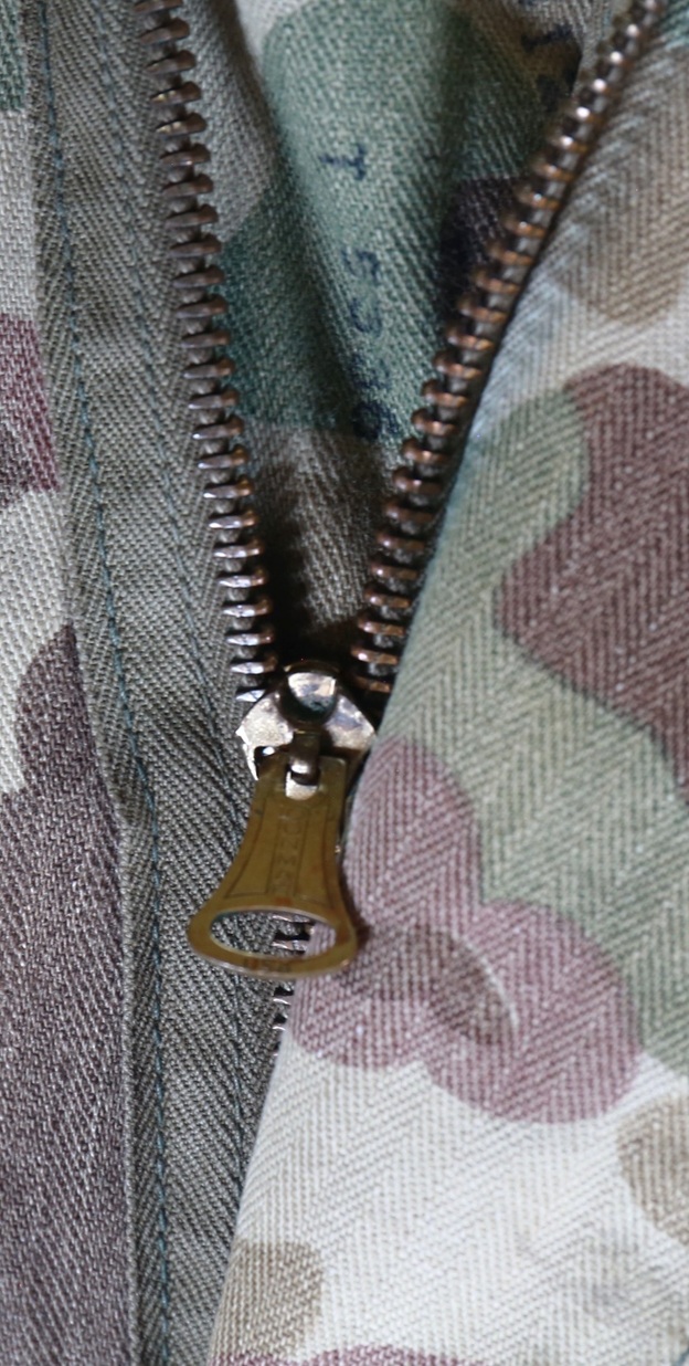 Manufactured for the US Army for jungle service the one-piece jungle suit saw early service in the Pacific by both the Army and Marine Corps.  By mid 1943 the one-piece was being replaced by a jacket and pants set.  The suit comes with built in suspenders to help hold the weight held in the large hip pockets. The suit is closed using the original Conmar zipper and a snap at top.  Pockets are held closed with 2 snap buttons one on each end.  These have seen actual field use and have 3 different stenciled laundry numbers.