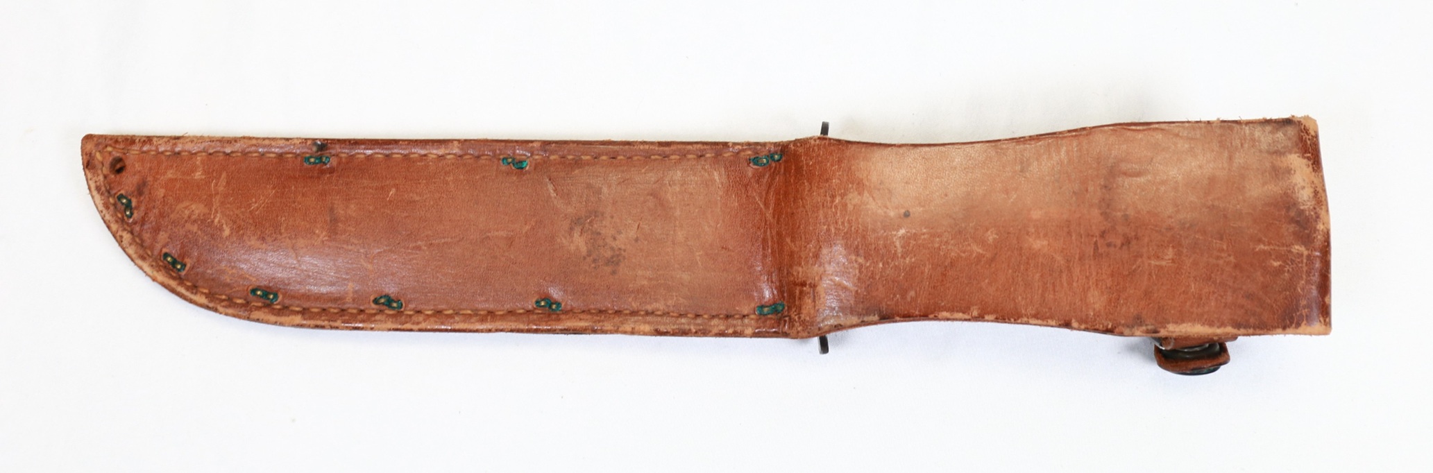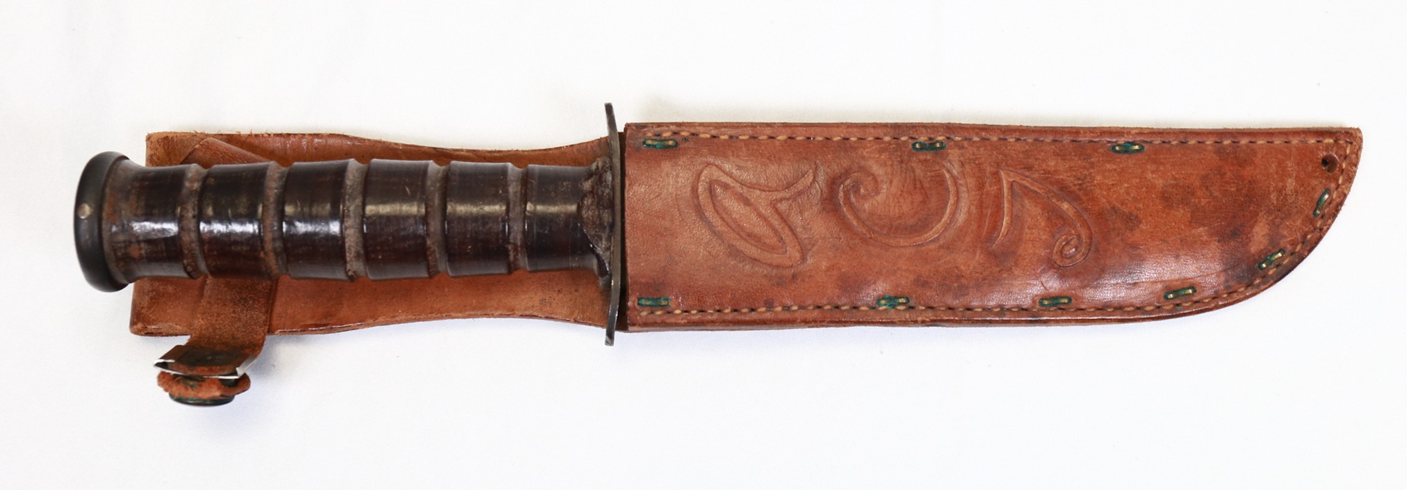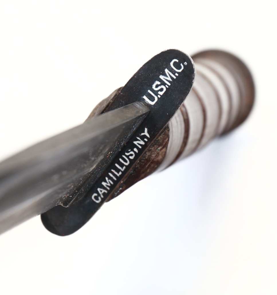 This is an excellent example of the WW2 USMC combat knife. The blade retains nearly 100% of the blackened finish with only the factory edge sharpening evident. The grip shows little wear and correct age. The cross guard is marked CAMILLUS, N.Y and U.S.M.C. The pommel is pinned and retains most all of the blackened finish. The scabbard, with owners’ initials, is also excellent with unaltered light-colored leather and stapled and sewn seams. The only flaw is a break to the latch tab, all leather still remains and could be repaired if desired.
