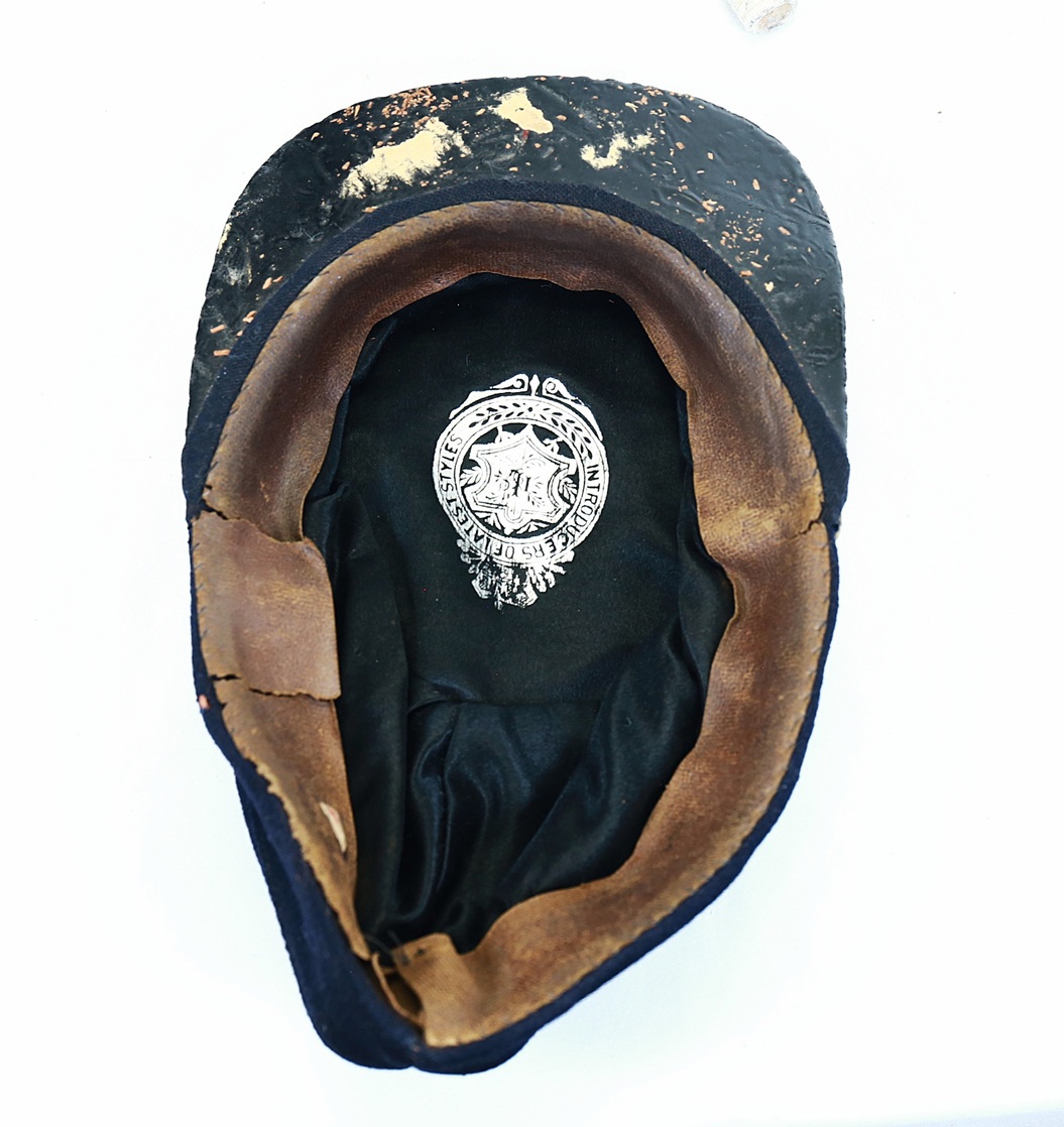 A fine condition M1872 officer’s forage cap. The cap consists of a dark blue wool body with patent leather visor and narrow leather chinstrap held in place by two general staff buttons. The interior has black polished lining with retailer’s logo “INTRODUCERS OF THE LATEST STYLES“. The sweatband is of very soft and of fine leather, it is complete but has two separations on left side.
