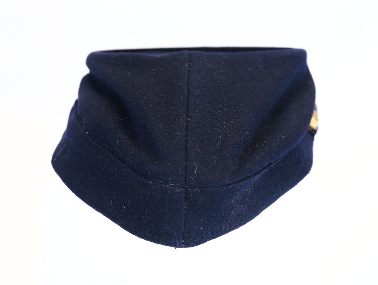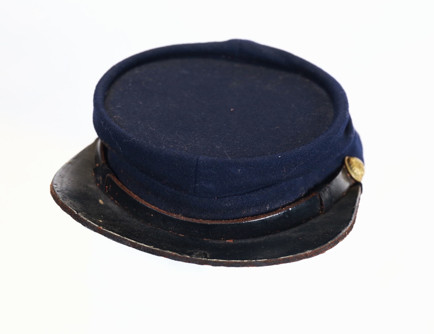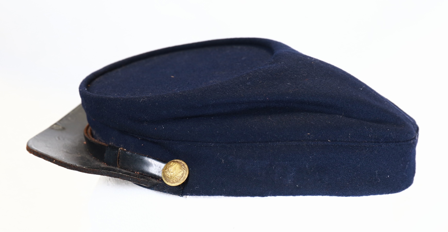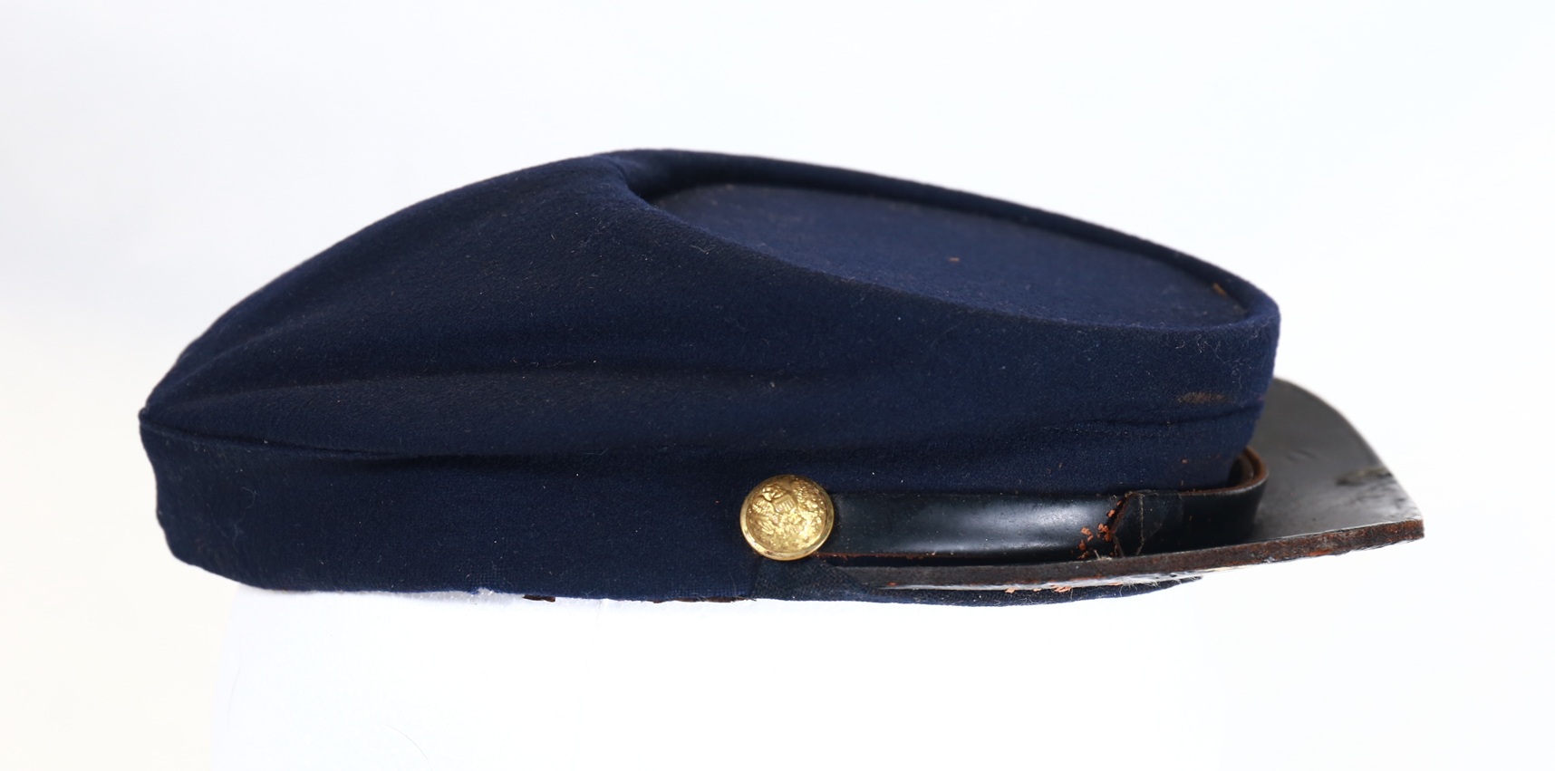 Condition is excellent with dark blue wool body with no insect damage. Buttons retain most of the gilt finish. Leather bill is still tightly attached and chinstrap is complete.