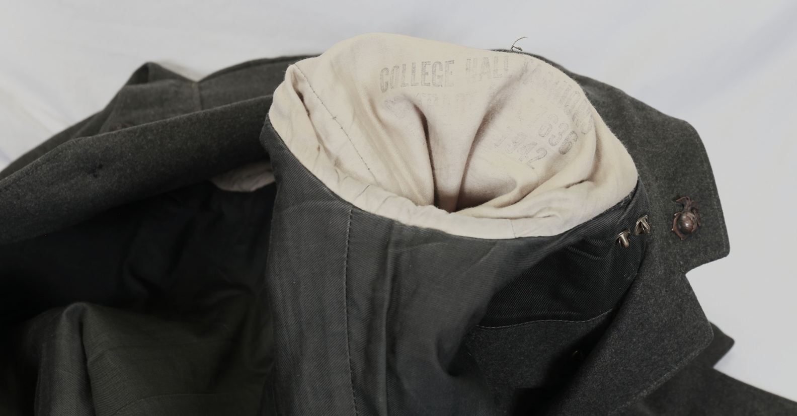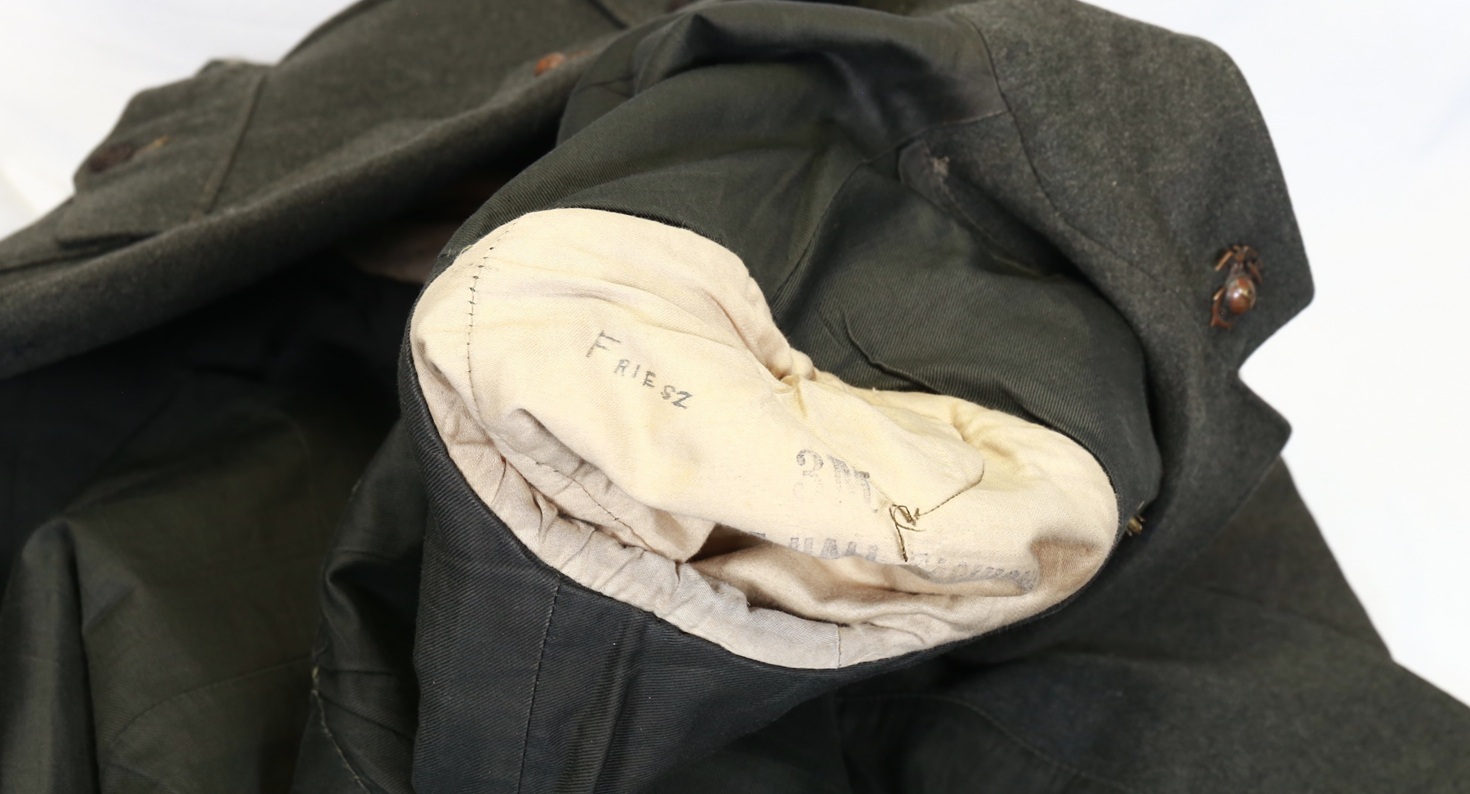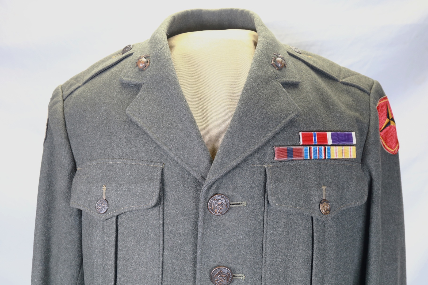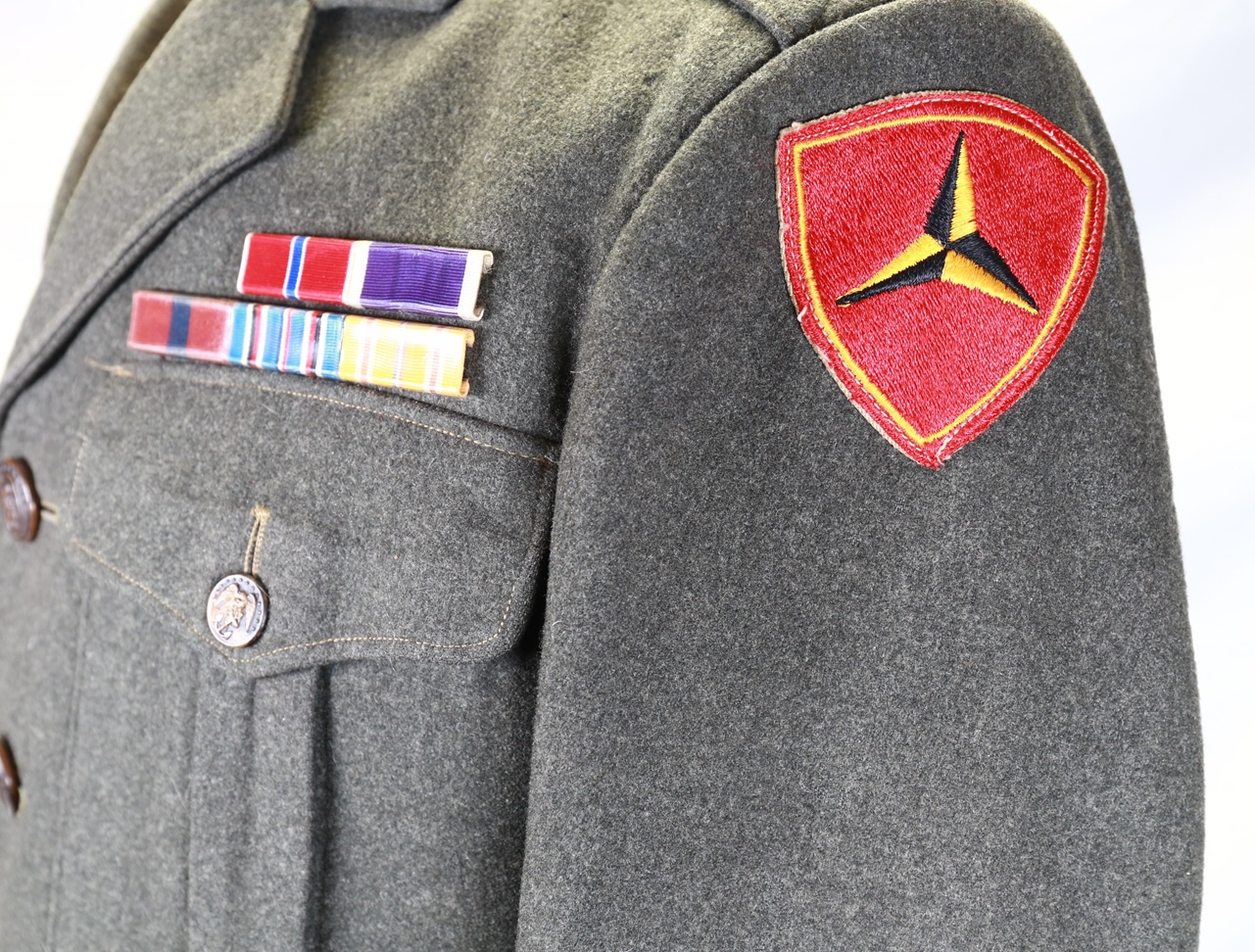 The coat is named to Private Robert E. Friesz, a rifleman in Co. G, 2nd Battalion, 9th Marines. Friesz was a bronze star recipient and was severely wounded in action during the invasion of Guam. He was wounded so severely that he was discharged due to disability, his coat having the white discharge diamond on right sleeve. Jacket has 3rd Division patch on left sleeve and both EGA’s on collar. The ribbons are the correct 1/2″ USMC/Navy type. The coat is in overall very good condition with only a few scattered small moth nips. After the war Friesz was heavily involved with disabled veteran organizations.