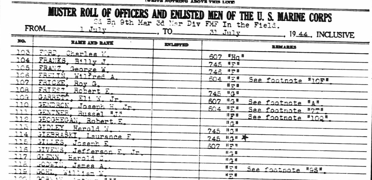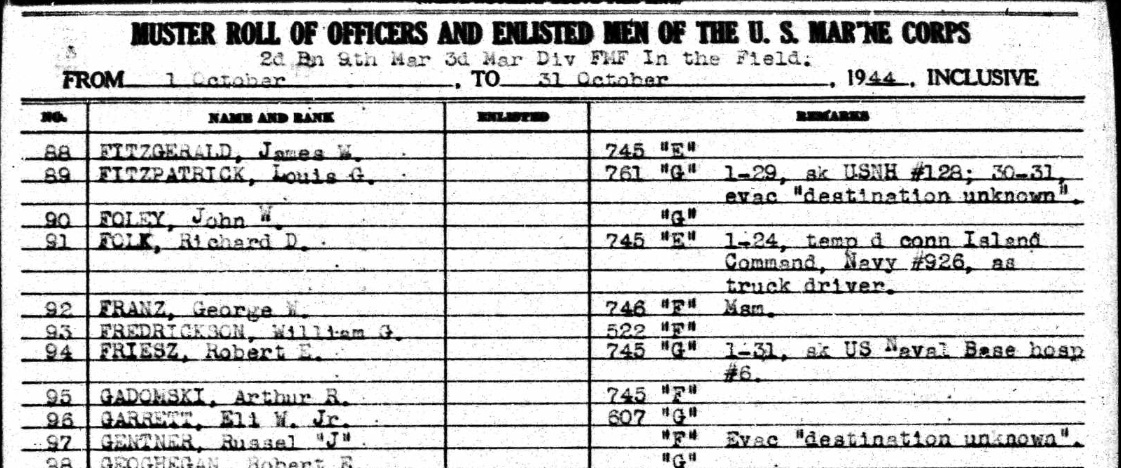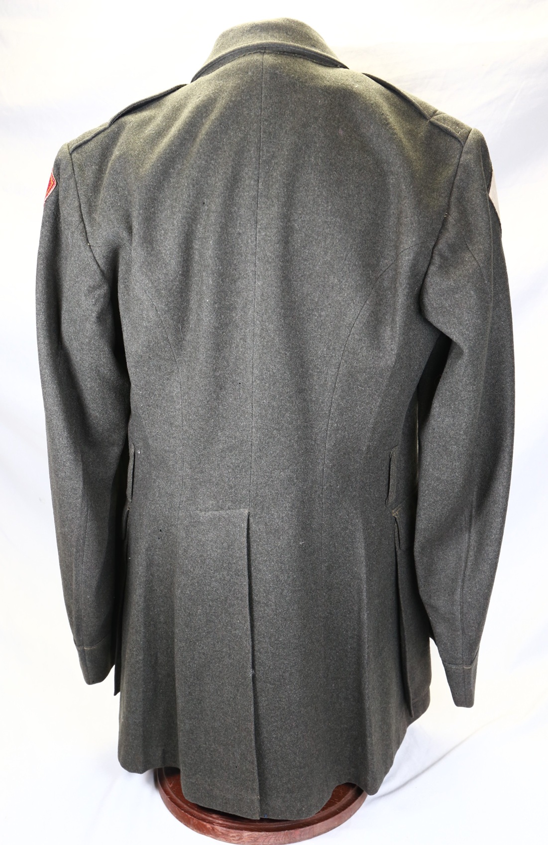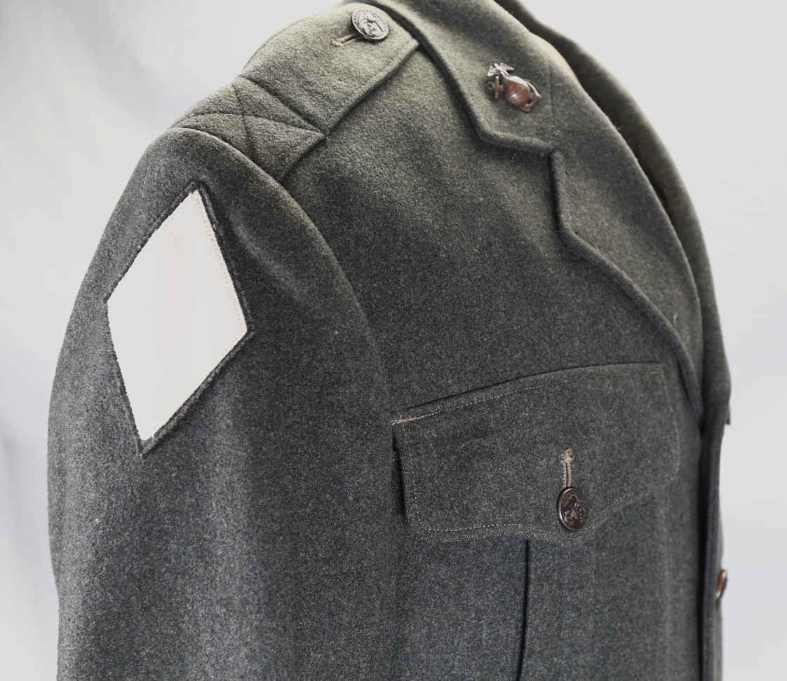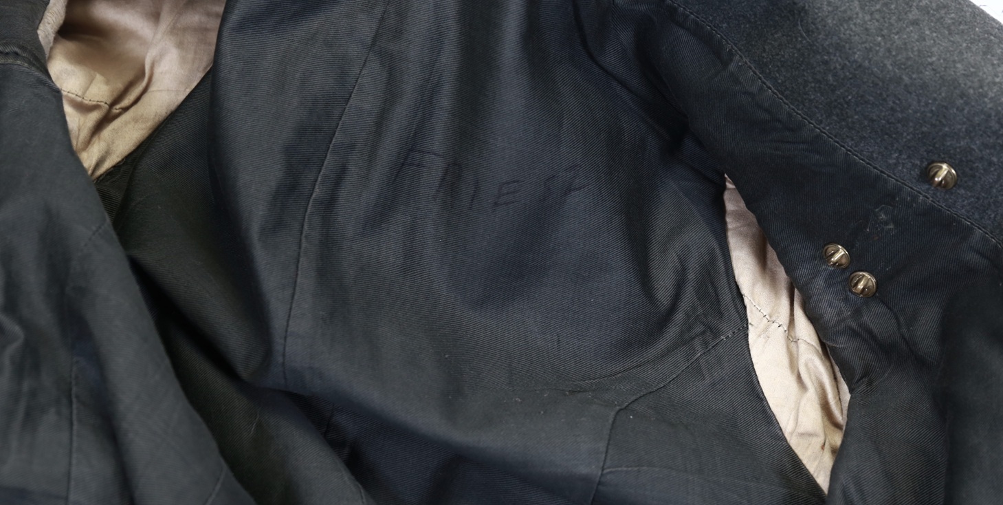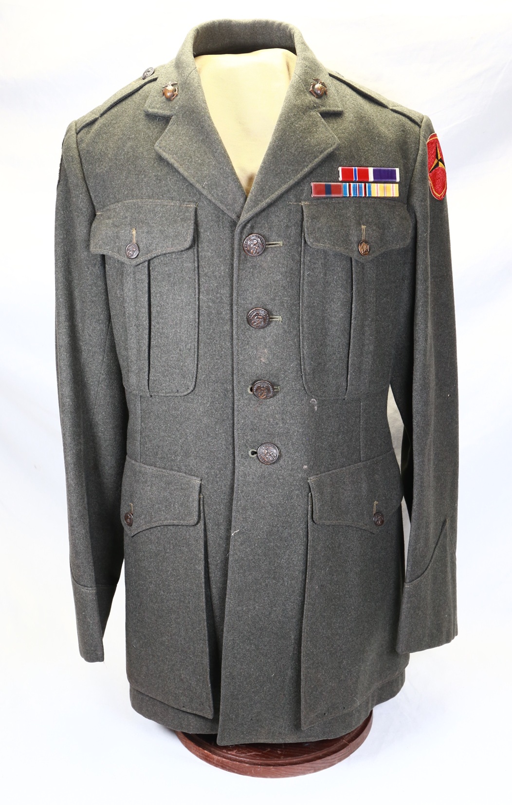 The coat is named to Private Robert E. Friesz, a rifleman in Co. G, 2nd Battalion, 9th Marines. Friesz was a bronze star recipient and was severely wounded in action during the invasion of Guam. He was wounded so severely that he was discharged due to disability, his coat having the white discharge diamond on right sleeve. Jacket has 3rd Division patch on left sleeve and both EGA’s on collar. The ribbons are the correct 1/2″ USMC/Navy type. The coat is in overall very good condition with only a few scattered small moth nips. After the war Friesz was heavily involved with disabled veteran organizations.
