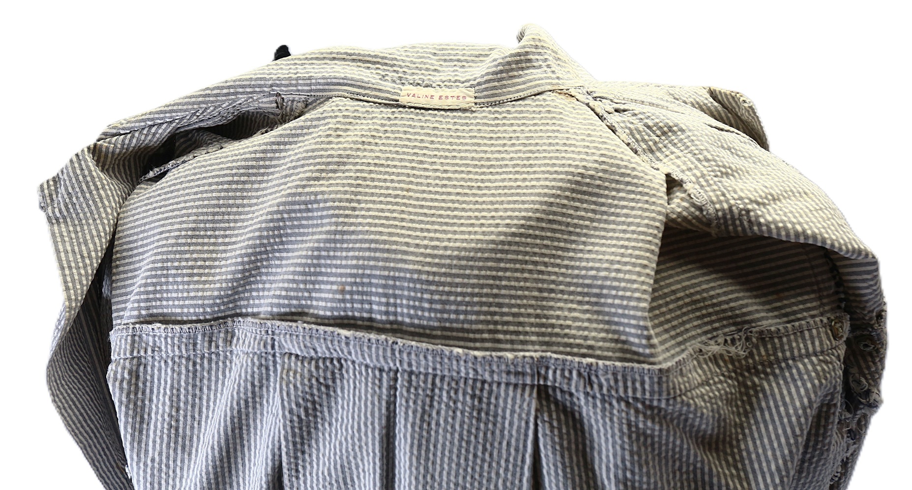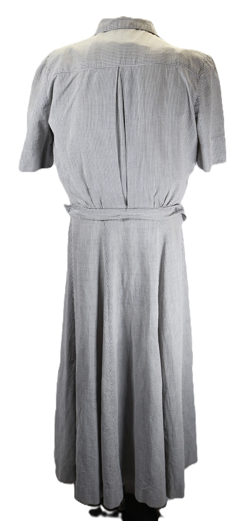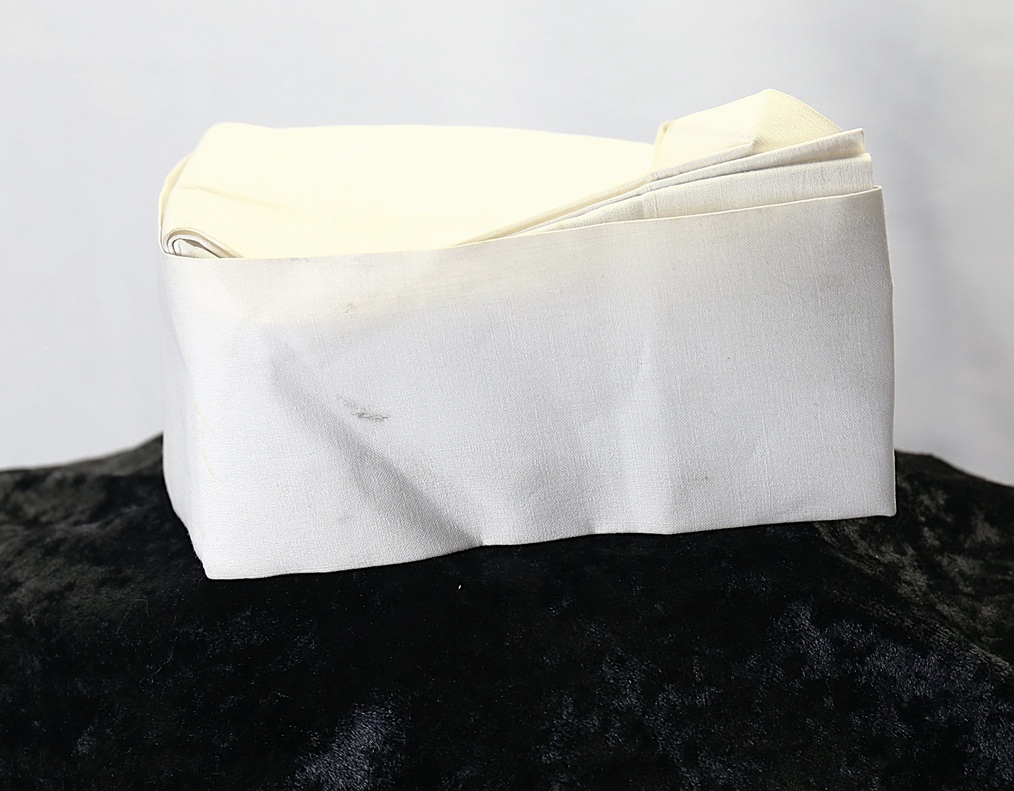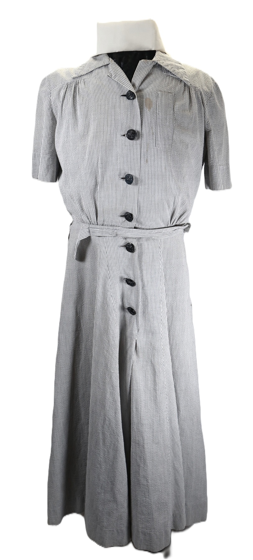 A U.S. Navy nurse’s Seersucker work dress featuring black plastic navy buttons and a traditional nurse’s work hat. The dress includes a small instrument pocket on the left chest and a buttoned instrument pocket beneath the left collar. A tag sewn into the inner back collar bears the name Valine Estes. She was commissioned in 1943 and served until her discharge after World War II in 1945. Her duty stations included hospitals in the Solomon Islands and Samoa. She was recalled for one year of service in 1950.