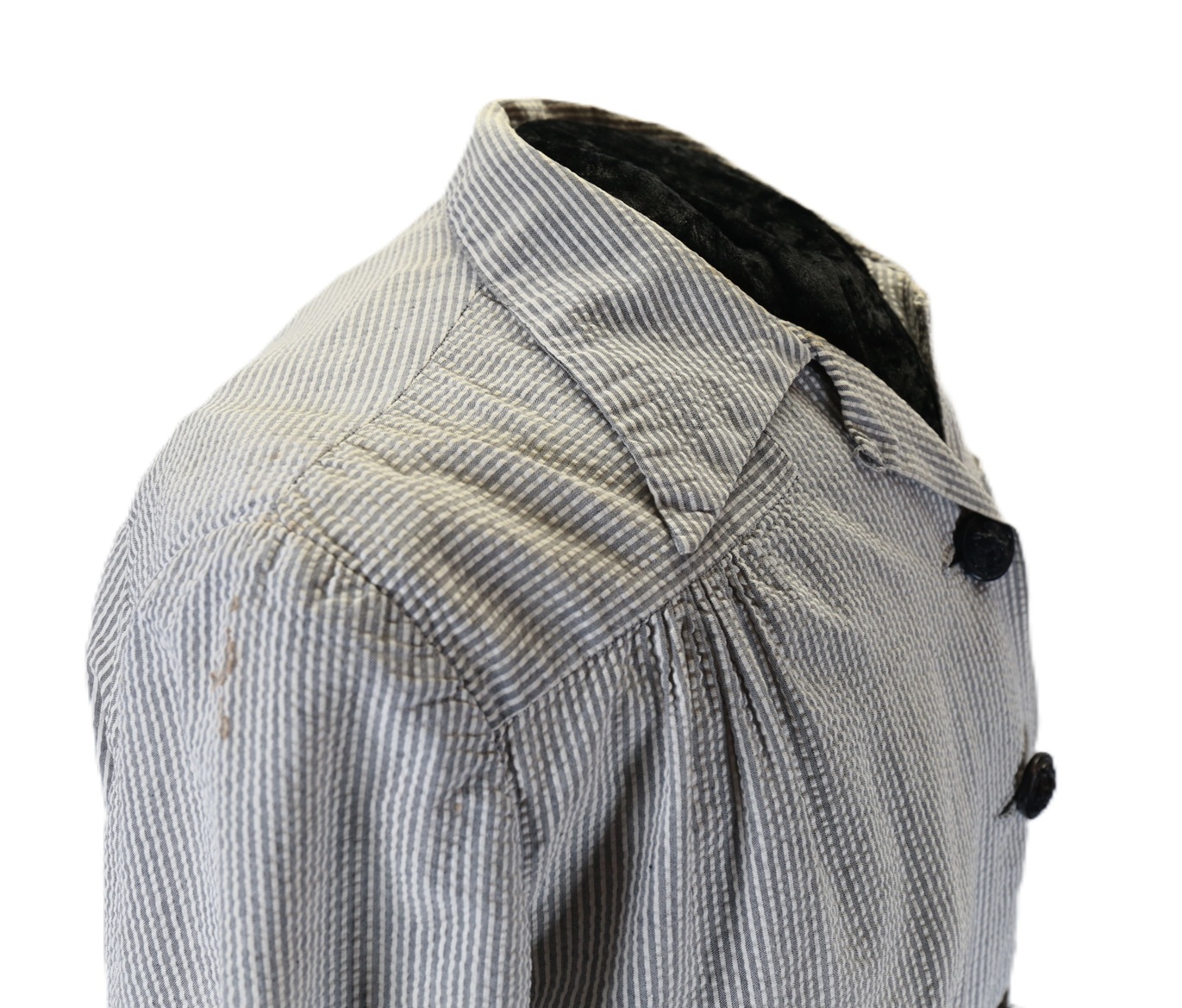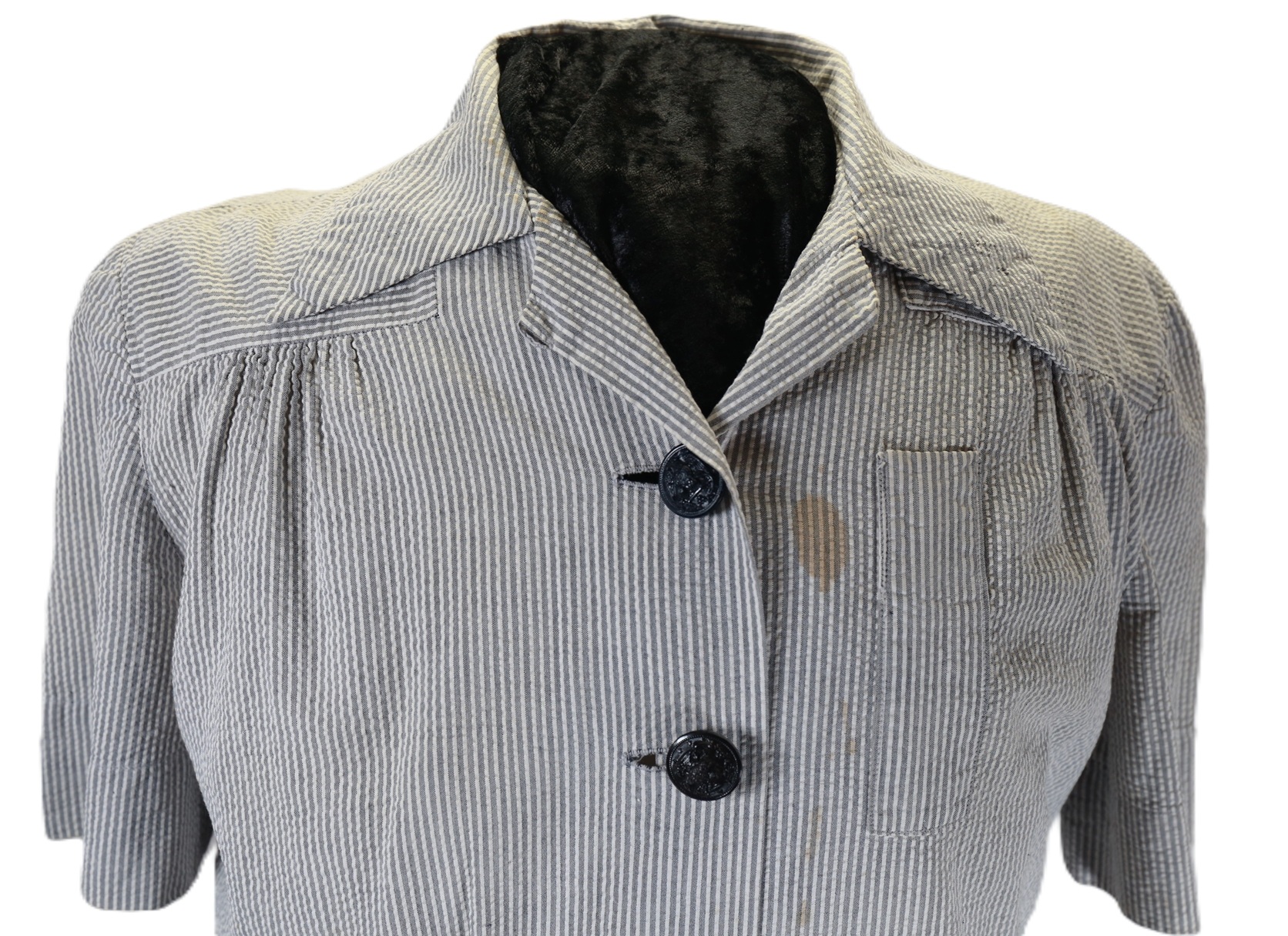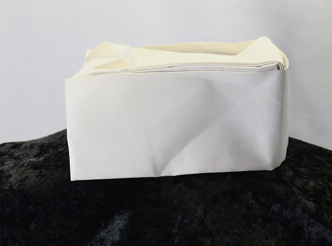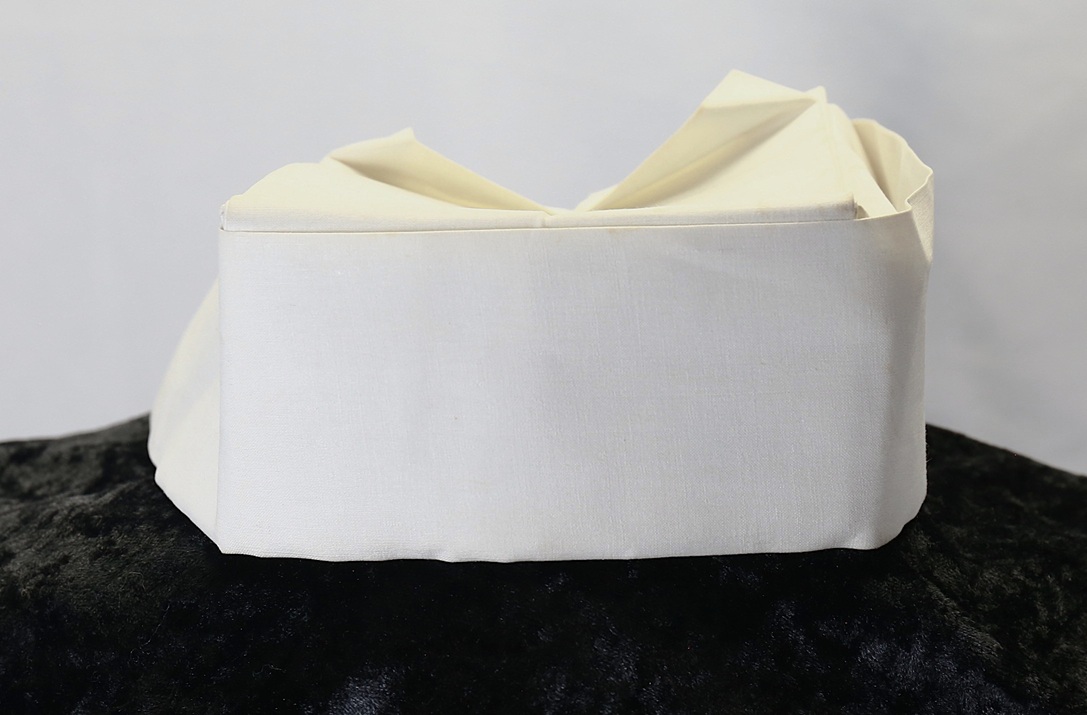 A U.S. Navy nurse’s Seersucker work dress featuring black plastic navy buttons and a traditional nurse’s work hat. The dress includes a small instrument pocket on the left chest and a buttoned instrument pocket beneath the left collar. A tag sewn into the inner back collar bears the name Valine Estes. She was commissioned in 1943 and served until her discharge after World War II in 1945. Her duty stations included hospitals in the Solomon Islands and Samoa. She was recalled for one year of service in 1950.
