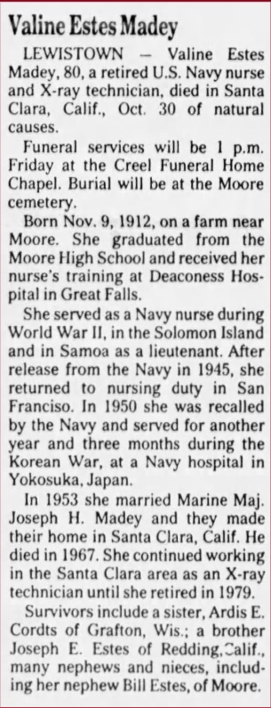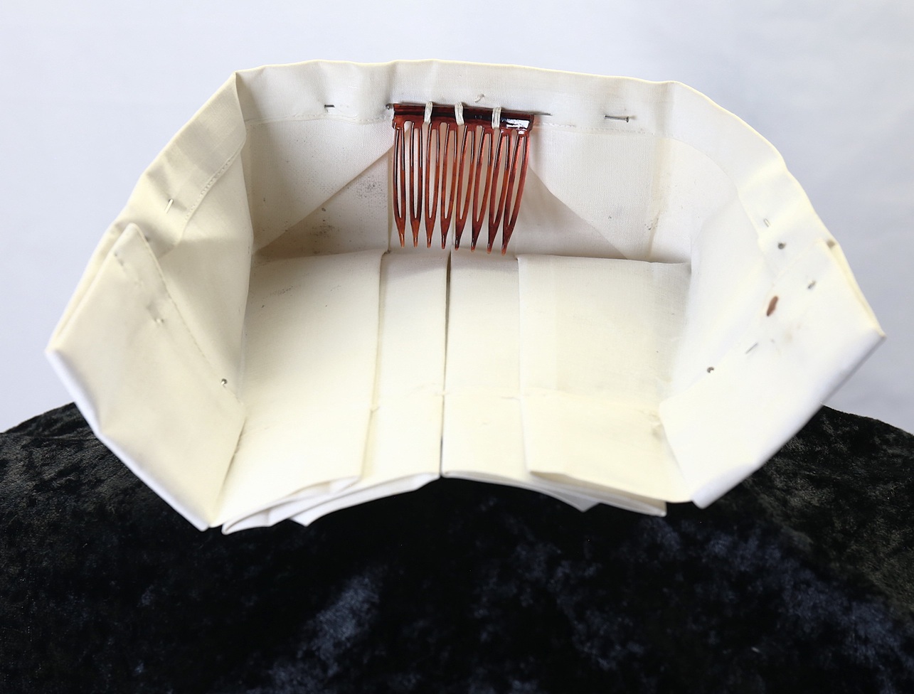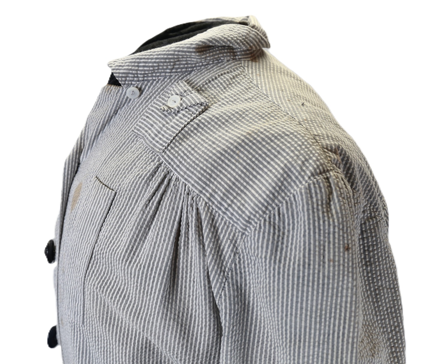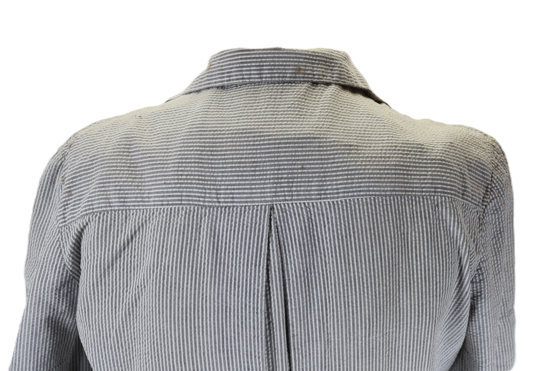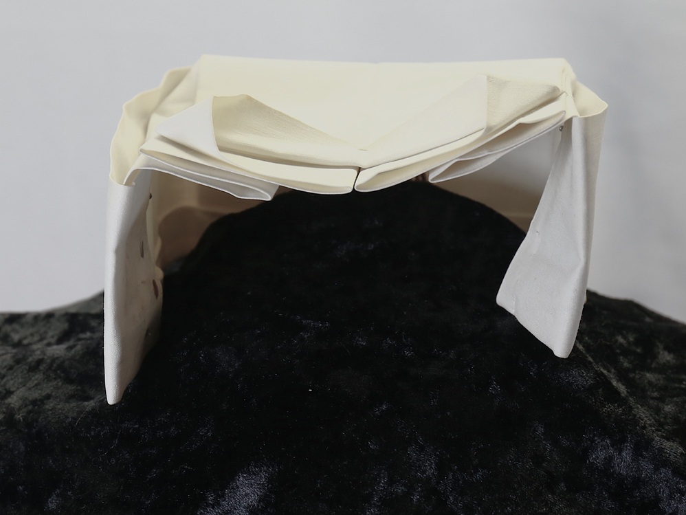 A U.S. Navy nurse’s Seersucker work dress featuring black plastic navy buttons and a traditional nurse’s work hat. The dress includes a small instrument pocket on the left chest and a buttoned instrument pocket beneath the left collar. A tag sewn into the inner back collar bears the name Valine Estes. She was commissioned in 1943 and served until her discharge after World War II in 1945. Her duty stations included hospitals in the Solomon Islands and Samoa. She was recalled for one year of service in 1950.