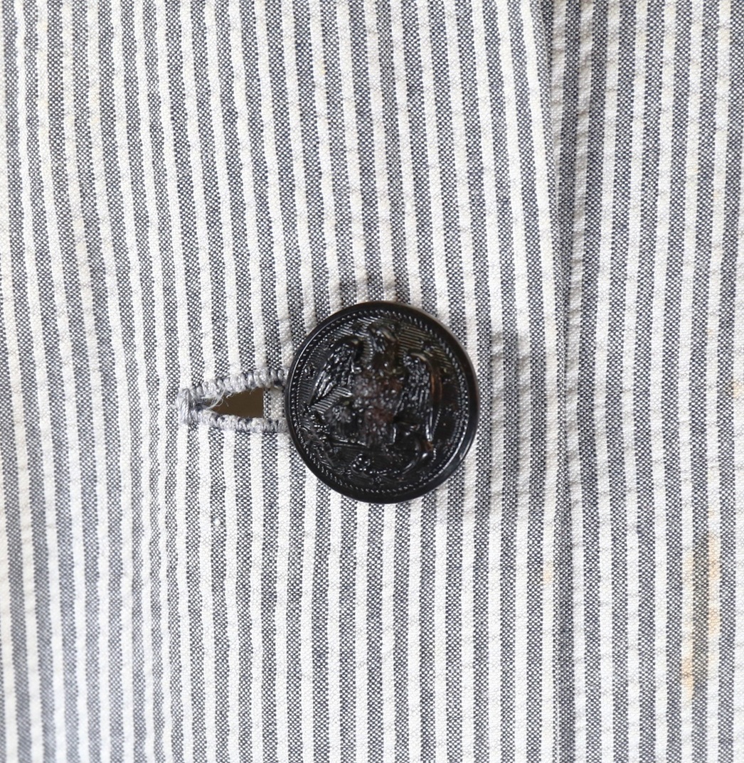 The overall condition is very good, with no tears or holes. There are some scattered stains, likely from her work. The attached waist belt is missing the double buttons that secure the cloth belt at the sides, which should be easy to replace. This piece originates from a very old collection, where the gentleman acquired his memorabilia directly from the family or the veteran..
