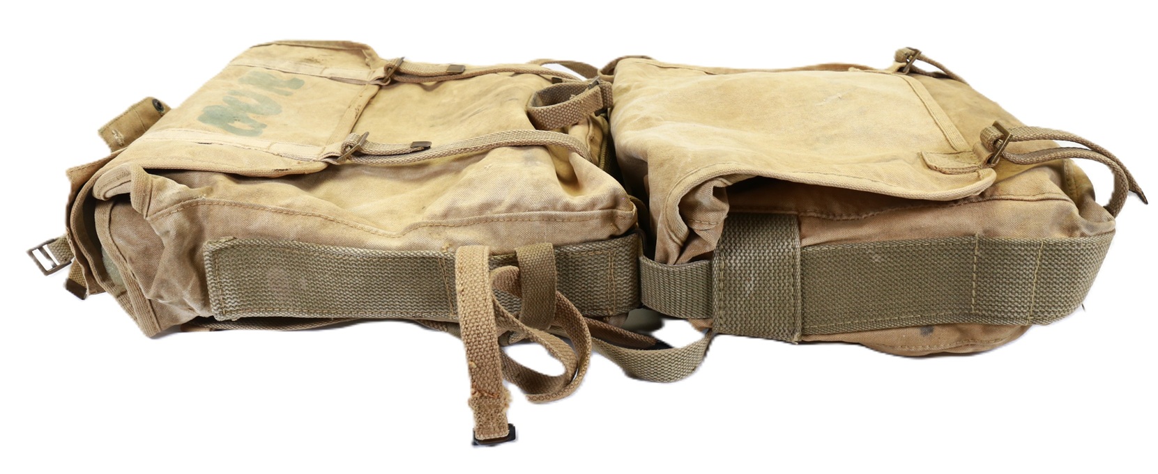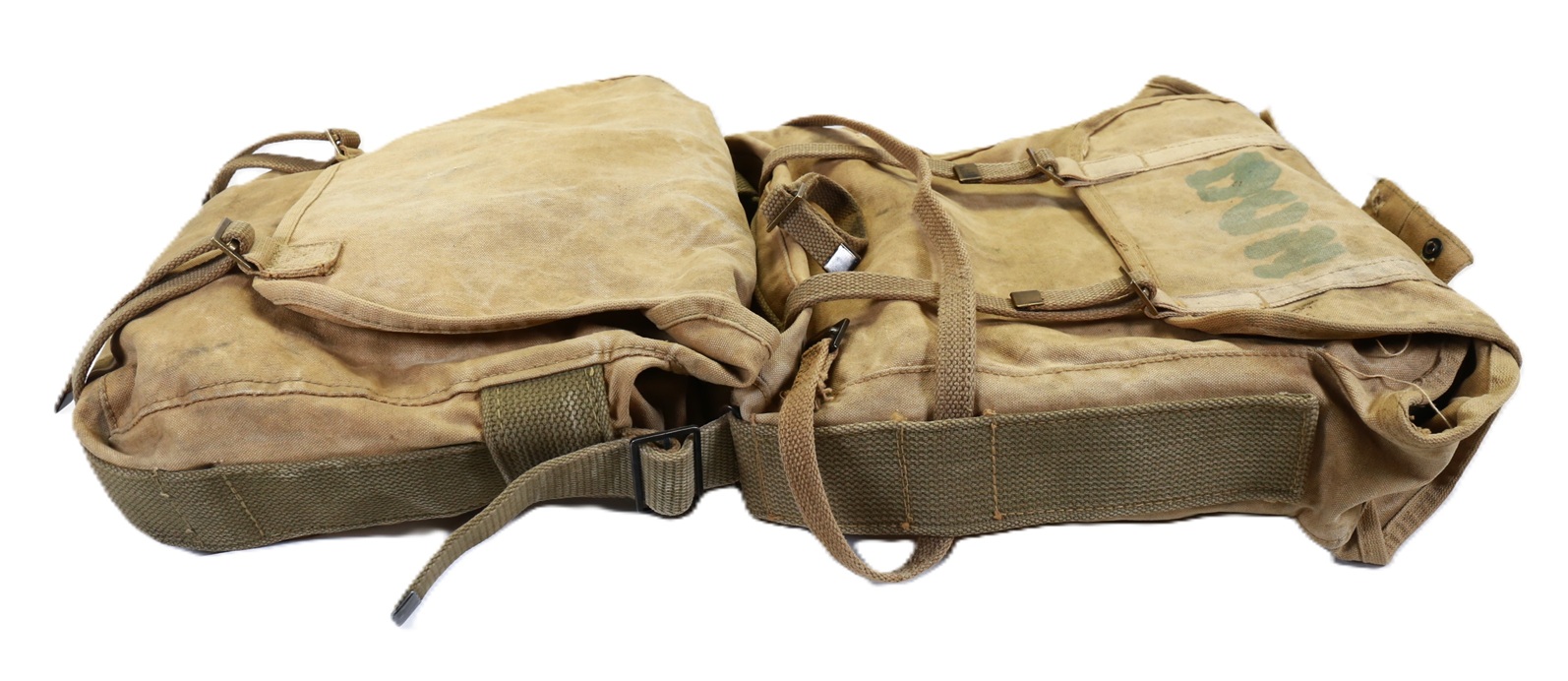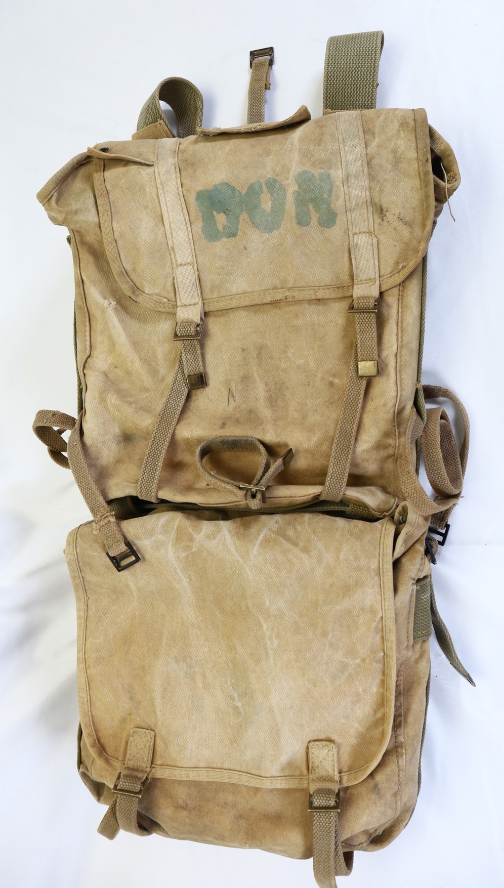 A very well-matched set of depot made upper and lower packs as used in every Pacific campaign of WW2. The set matches consistently enough that I would think they have been together since last used by a Marine. All of the straps are present including shelter half/poncho straps. The upper poncho strap has some loose stitching and one of the eyelets on shovel carrier is missing. Both packs show use and wear consistent with battlefield use. Getting difficult to find a truly matching set.