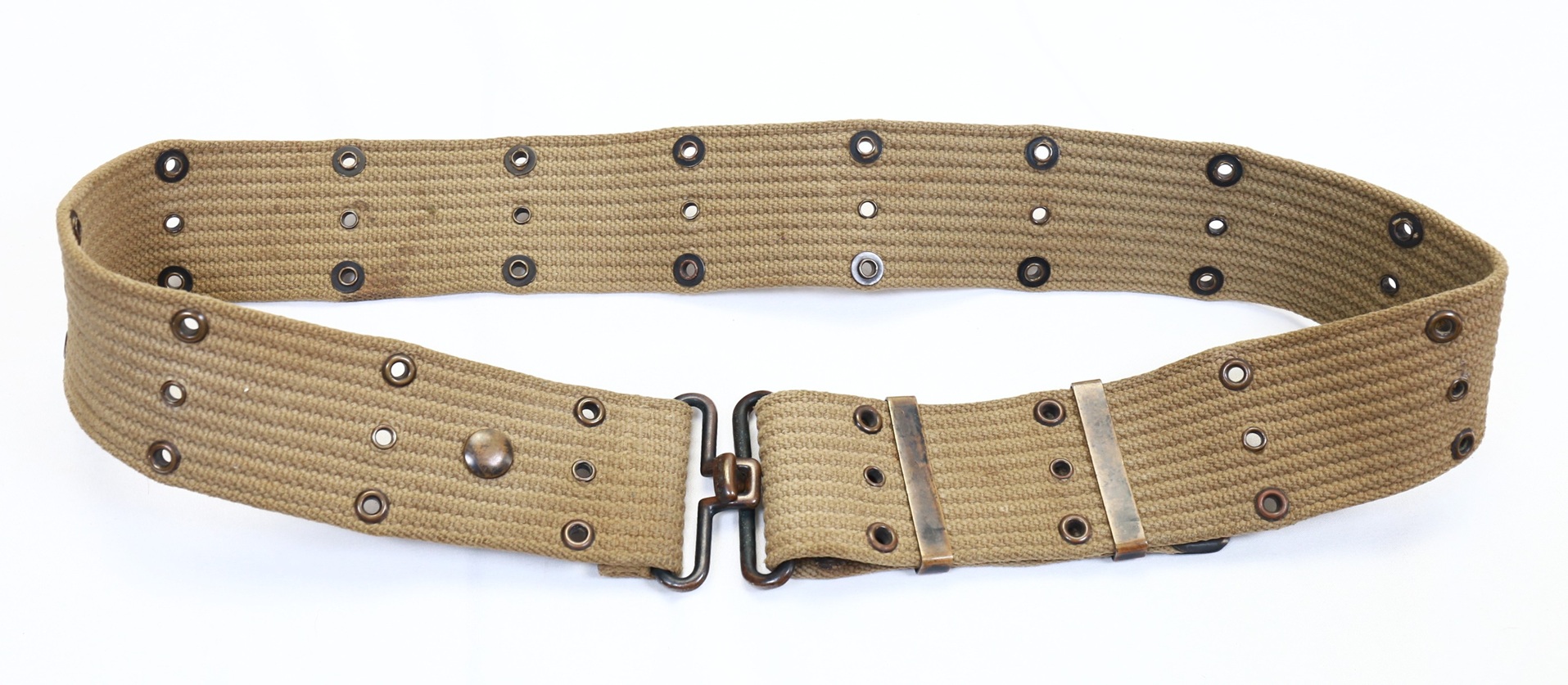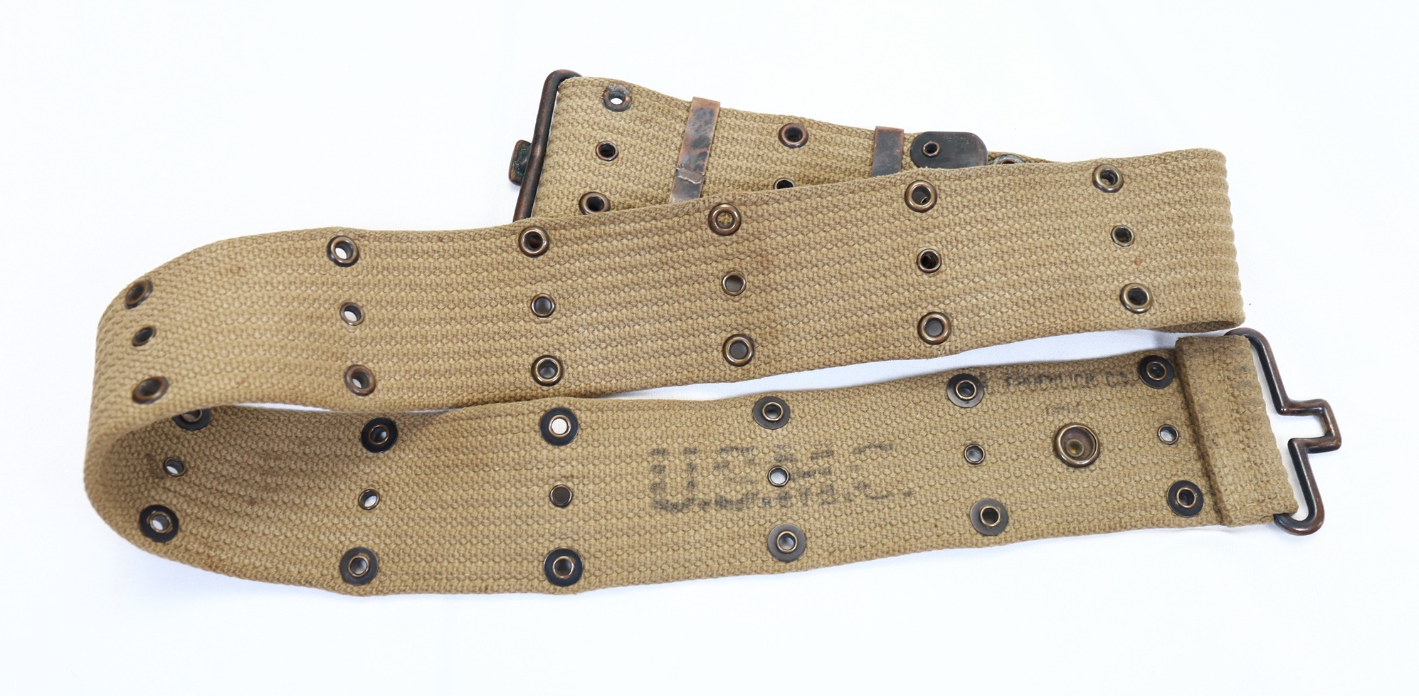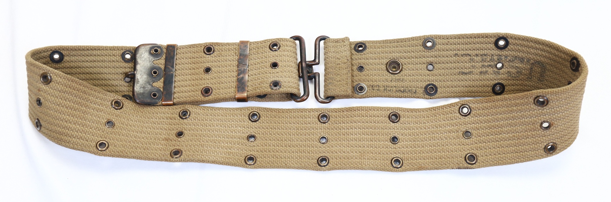 An excellent condition USMC marked pistol belt. Buckle is blackened brass along with the grommets. Looks to be dated 1942 with illegible maker stamp. The USMC marked belts are a true rarity and you will see a thousand army issued belts for every one of these.