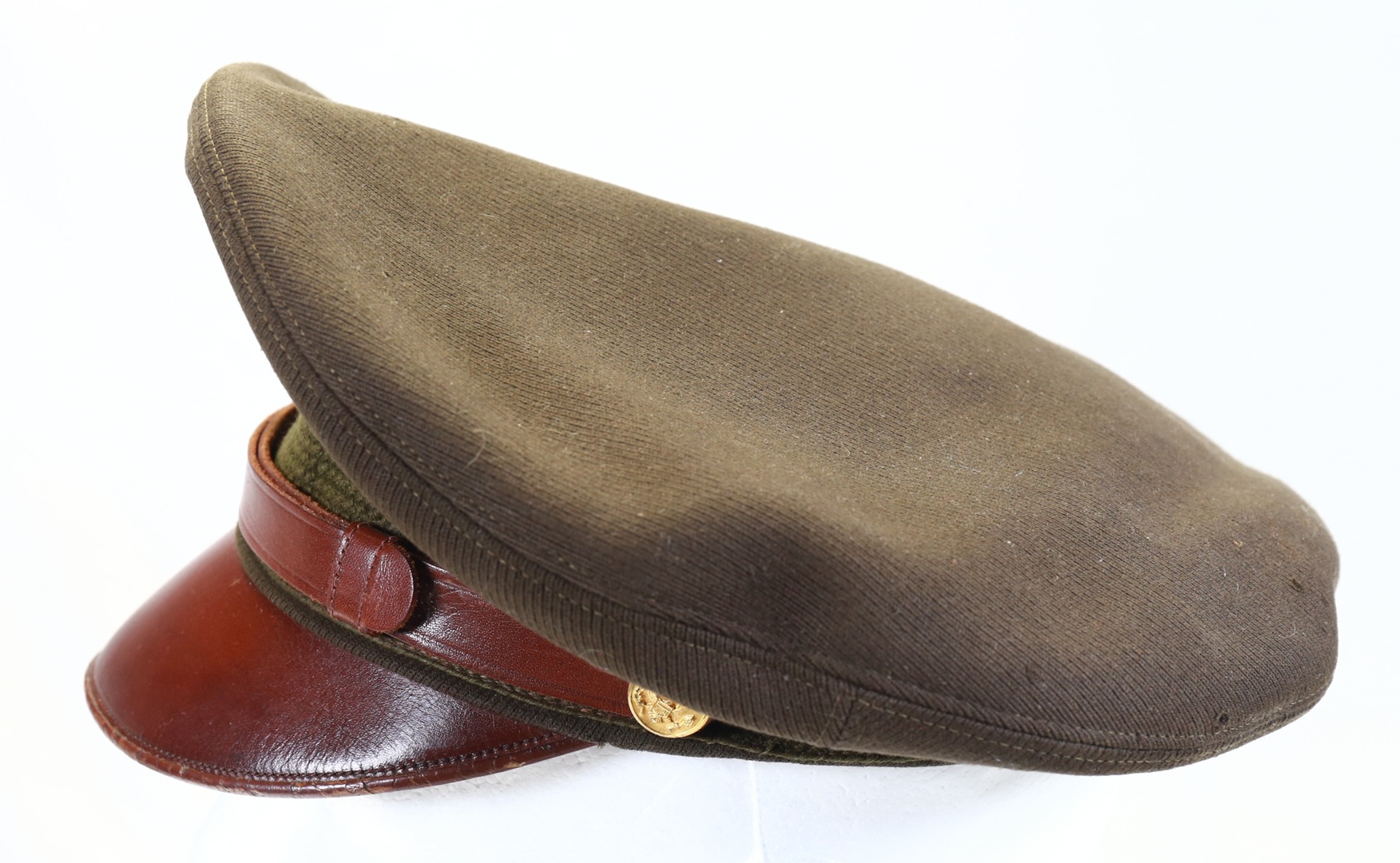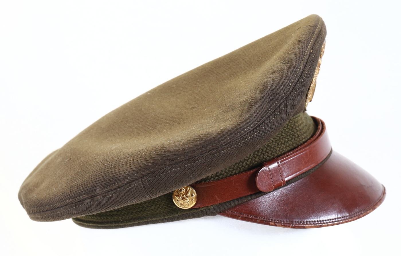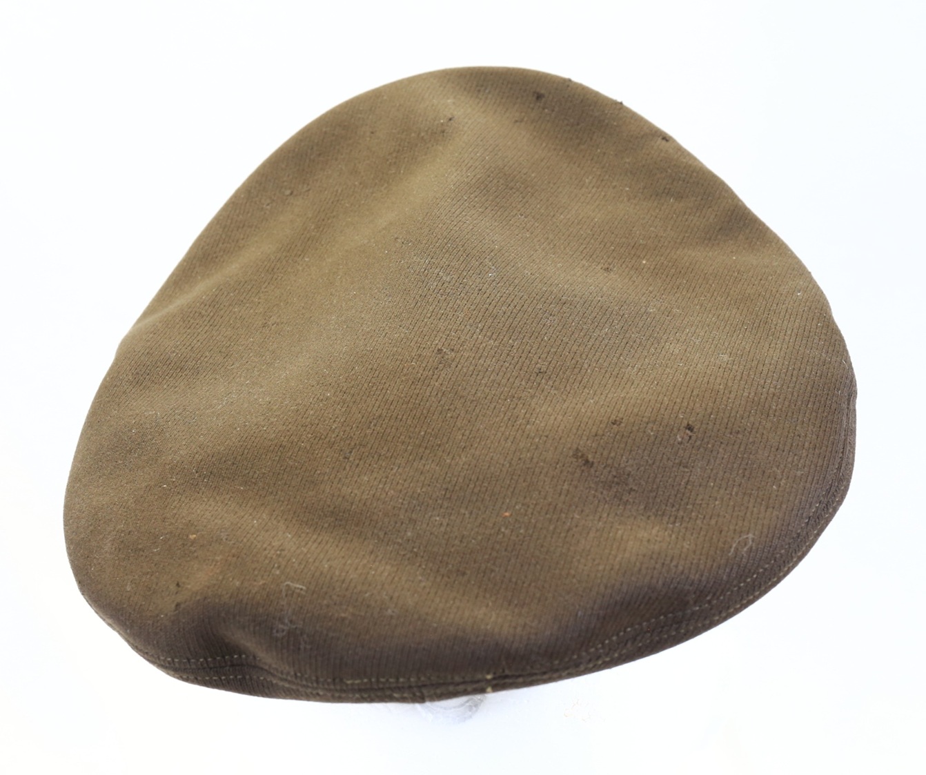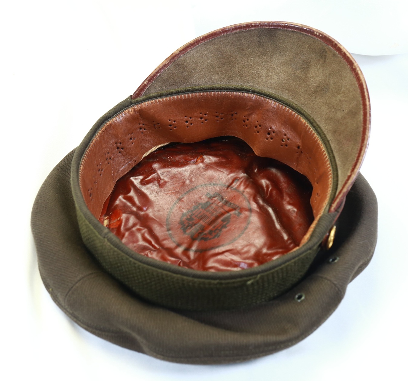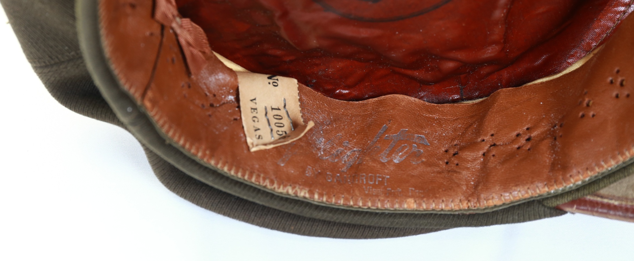 This is an excellent example of an Air Corps pilot’s crusher cap, made by Bancroft with “FLIGHTER” in silver on the sweatband. The sweat shield and stitching are fully intact, and the cap bill remains as soft as when it was first made. There are a few insect tracks on the top, but nothing significant. A rare and highly sought-after piece.