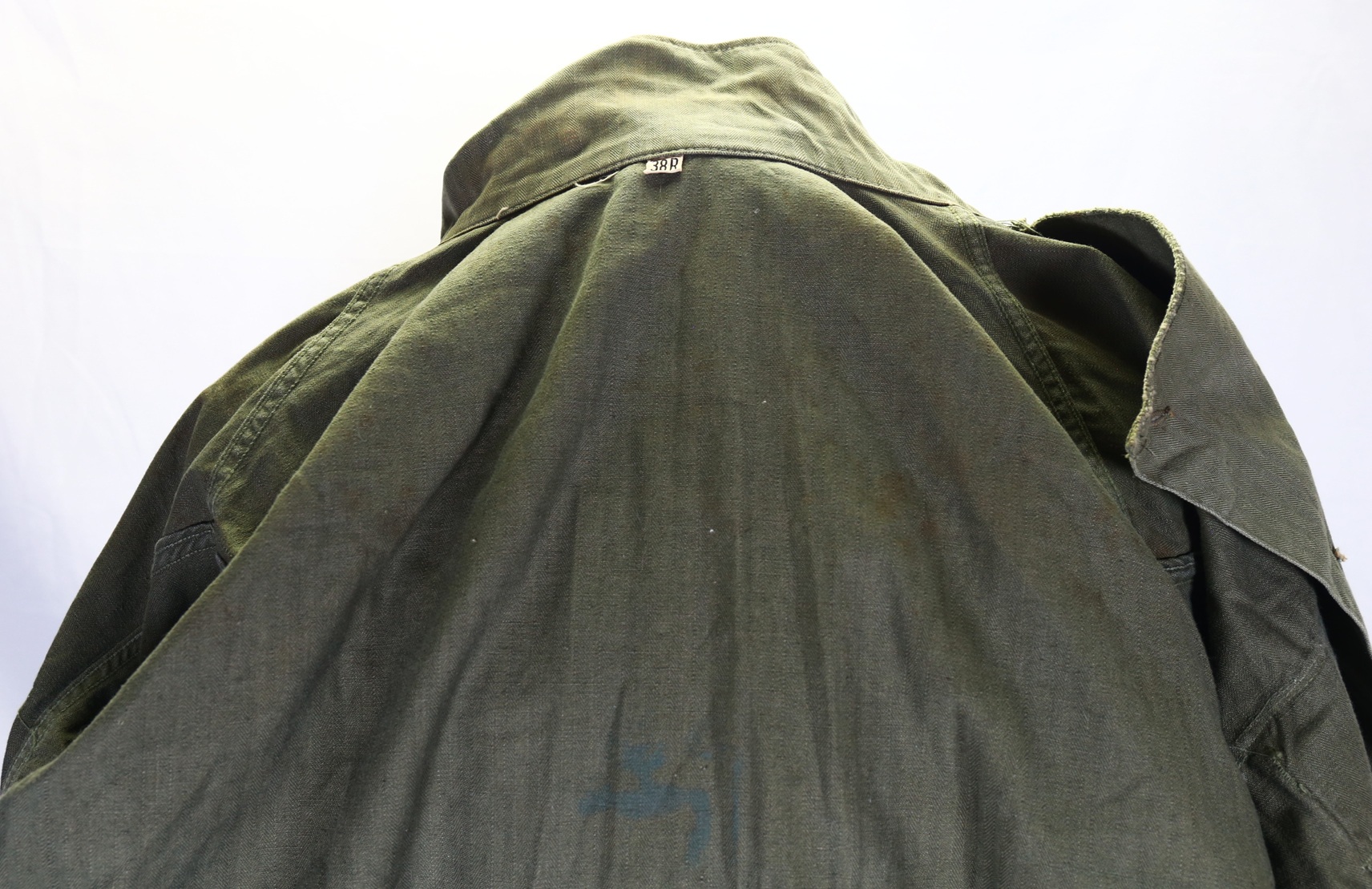 A Special pattern jacket with gas flap. These were only made in 1943 and were termed the 45C by the Quartermaster Dept. Condition is excellent with just minor wear and some scattered light stains from storage over the years. Interestingly, the back has an unknown to me, tactical symbol in blue/green paint lightly applied.  Size is 38R.  Pockets are the non-gusseted type. All buttons are present and in excellent condition.