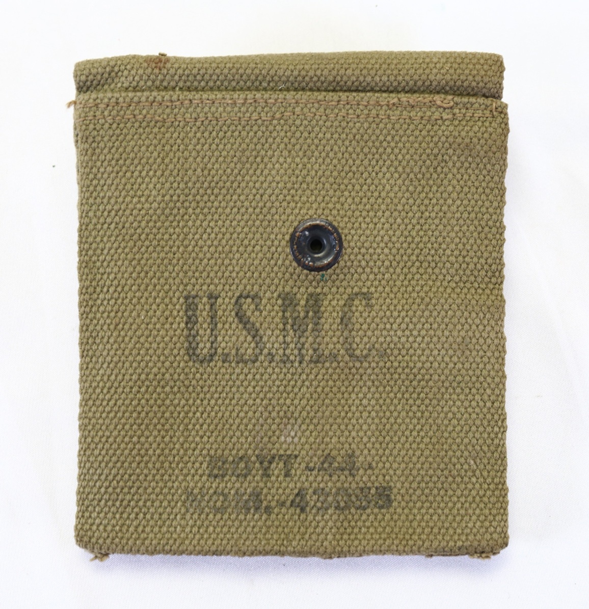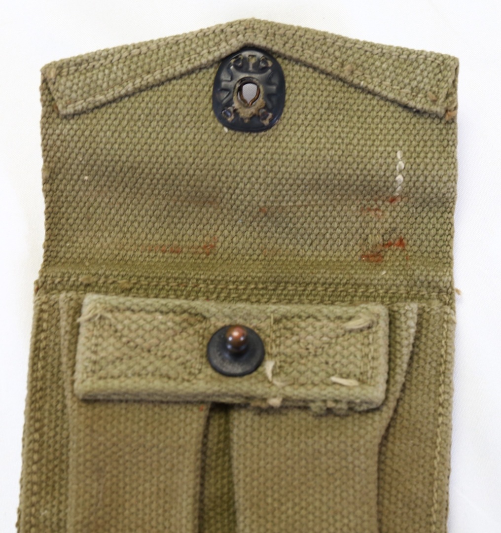 This is a 1944 dated Boyt made Marine Corps carbine/pistol magazine pouch. Condition is overall very good showing signs of field wear. Markings are clear and tab is fully functional.