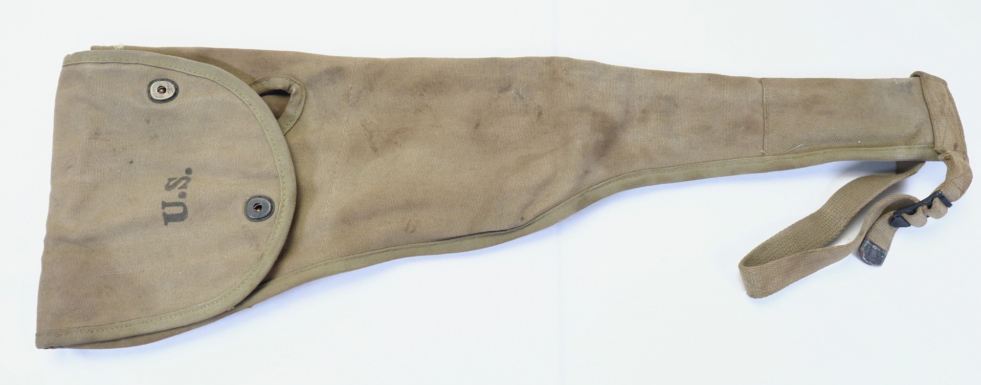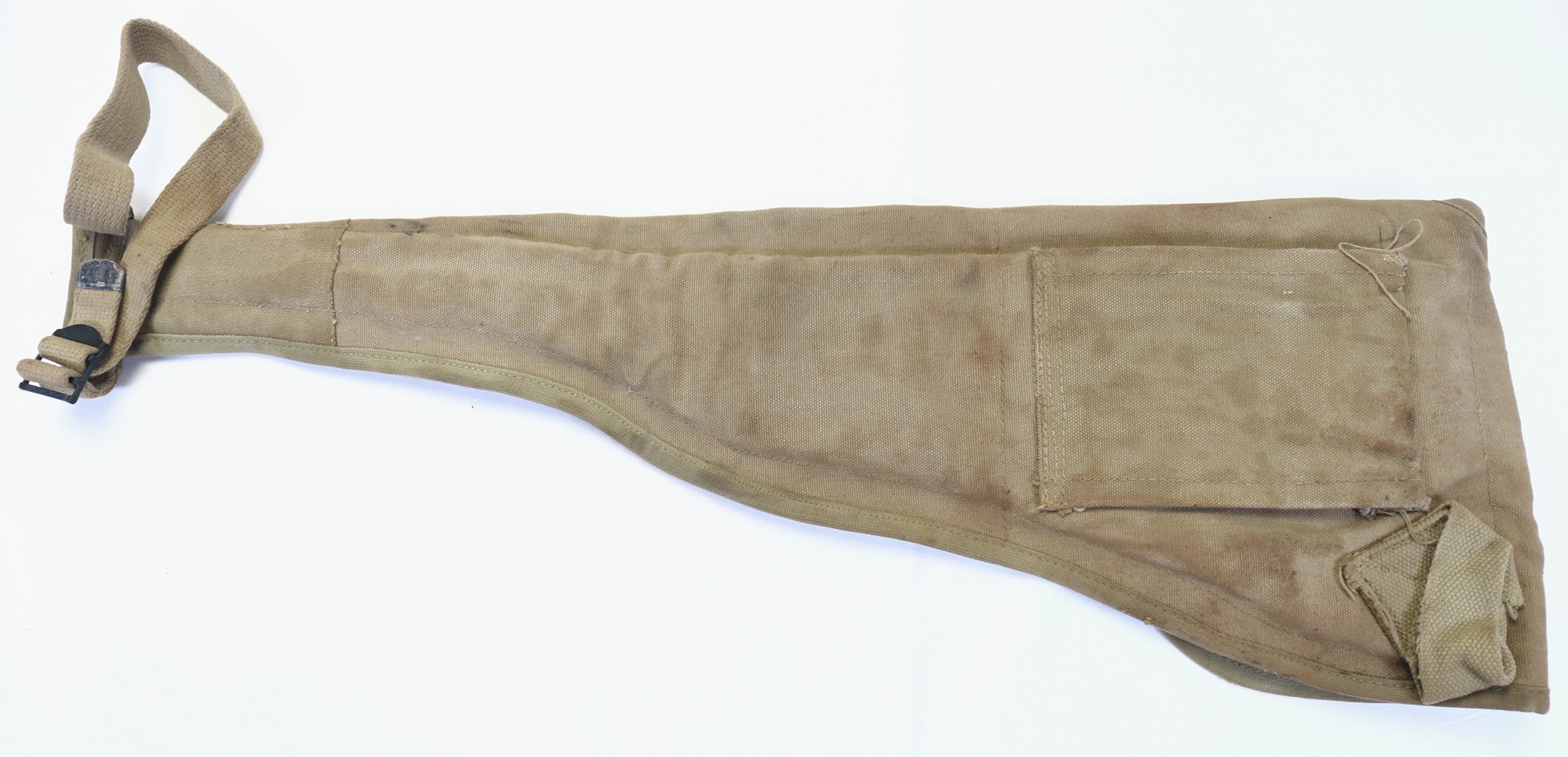 This is an excellent and issued example of a WWII Paratrooper Jump Case for the M1A1 Carbine. Also known as the Scabbard, M1A1, Jump Case, or Paratrooper Holster, it was designed to carry and protect the M1A1 folding stock carbine during parachute jumps. The bags are padded with felt on the side facing the leg. The canvas belt holster was strapped to the leg at the bottom and slipped over the belt or parachute harness using a large belt loop. Since attaching it to both the belt and leg would restrict leg movement, it is presumed that the holster was primarily secured to the webbing.