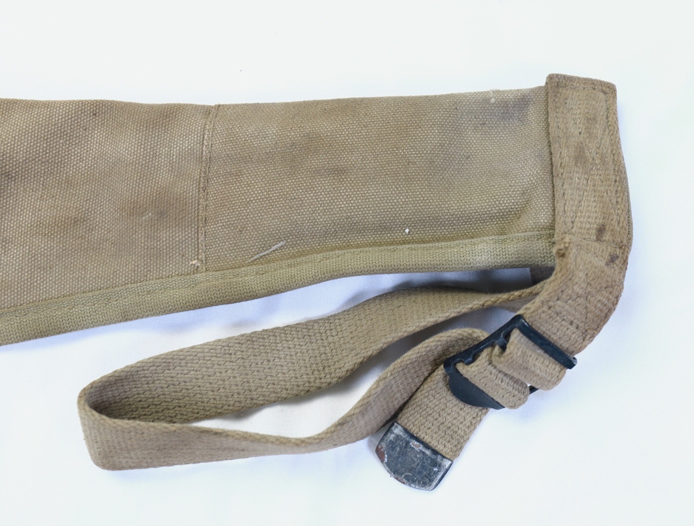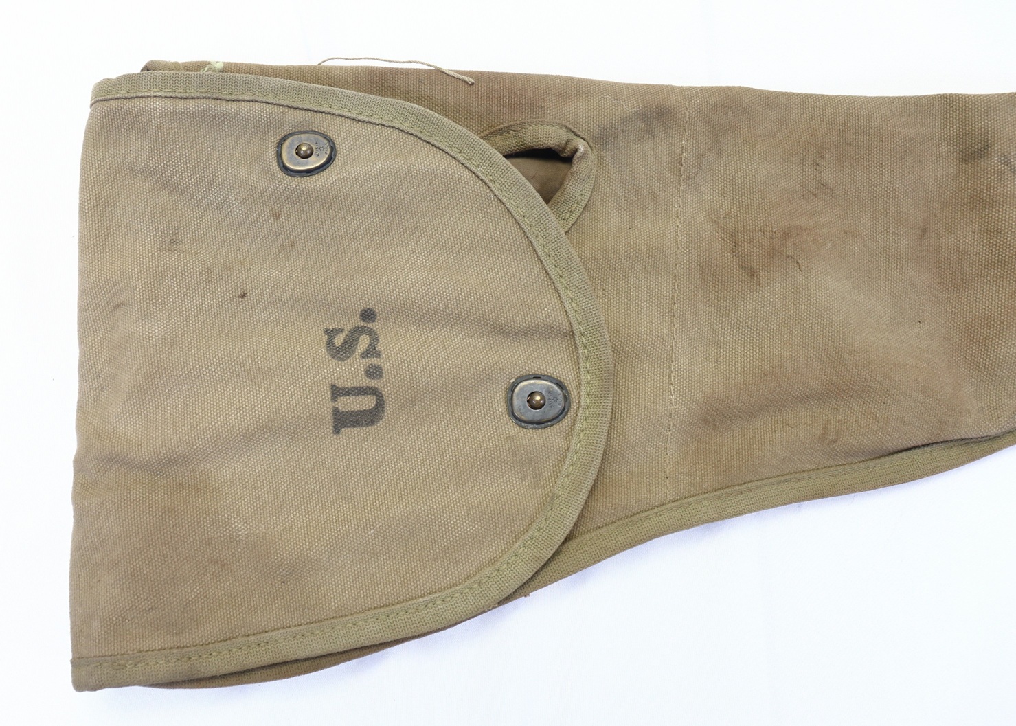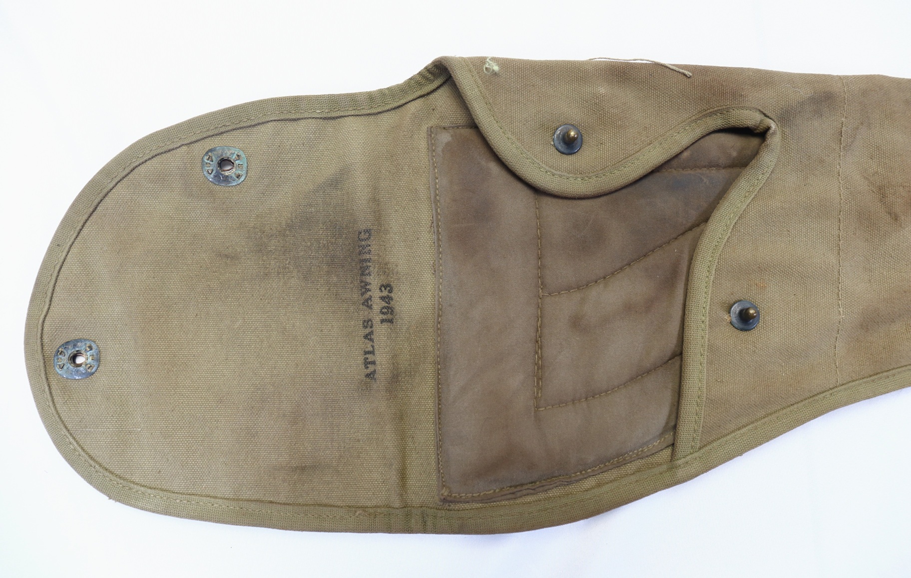This is an early example made in the lighter shade OD 3. This one is marked on interior of closure flap by Atlas Awning and dated 1943 with U.S. stamp on outer flap. It has been issued and shows some wear and staining.