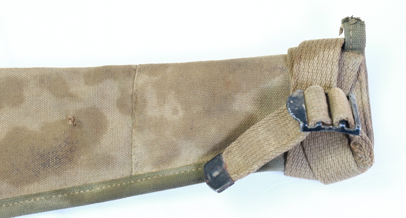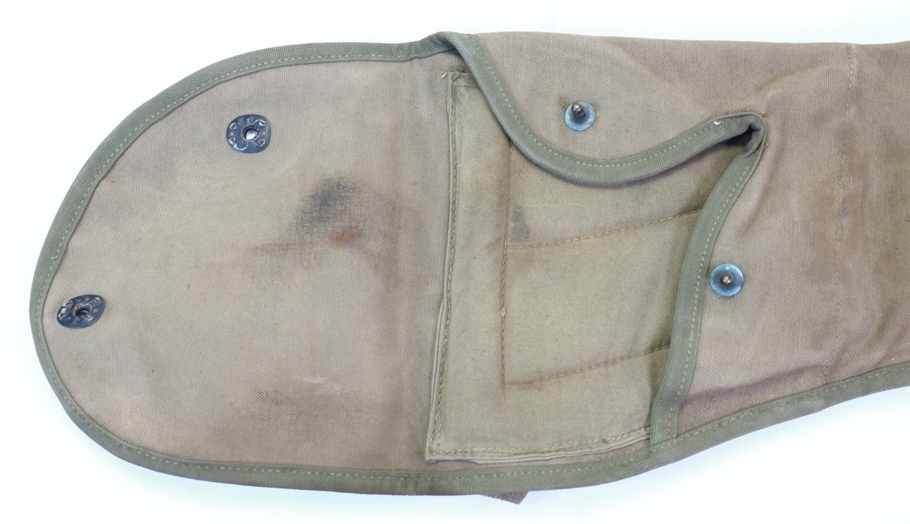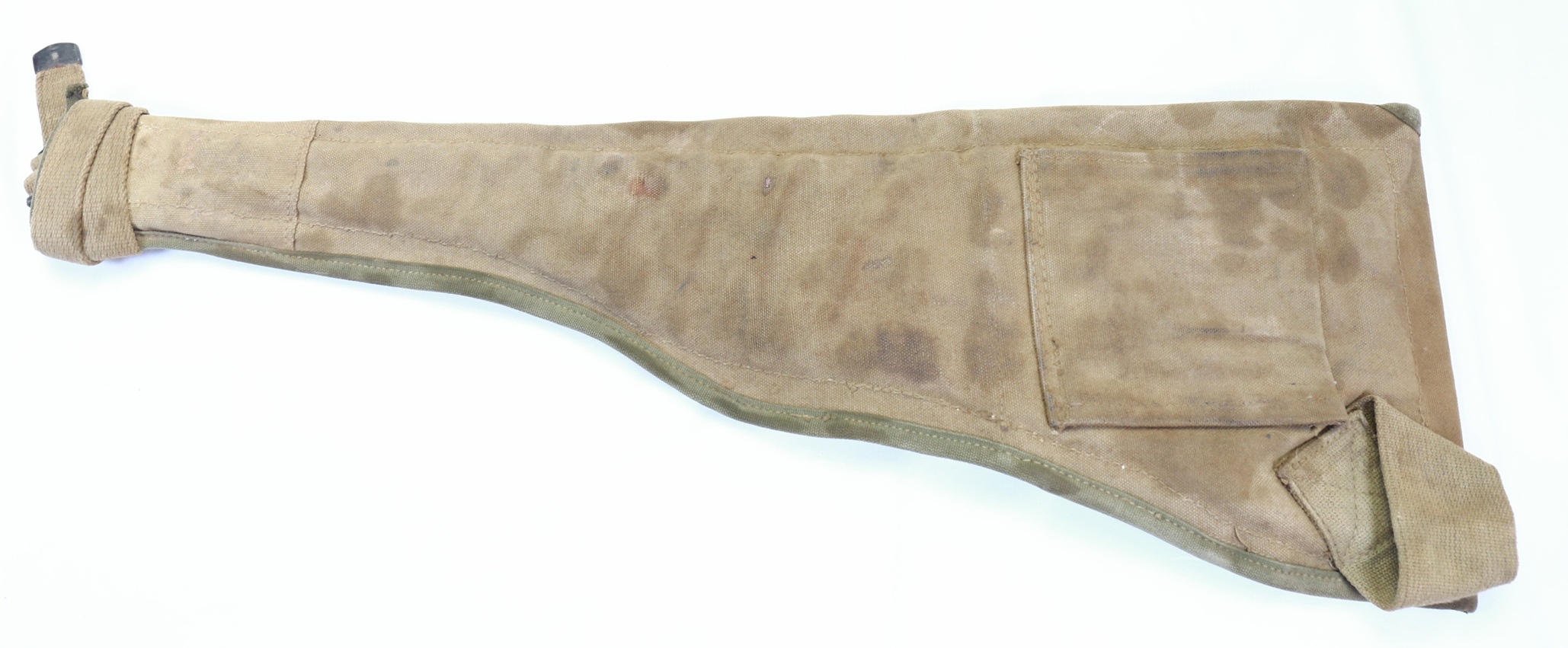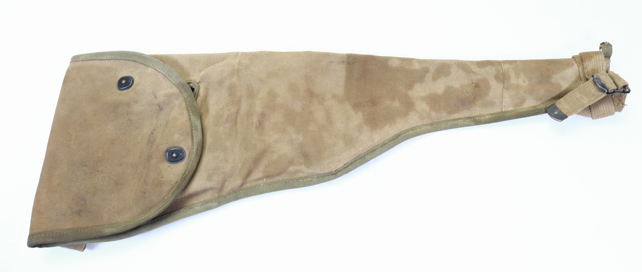 This is an excellent and issued example of a WWII Paratrooper Jump Case for the M1A1 Carbine. Also known as the Scabbard, M1A1, Jump Case, or Paratrooper Holster, it was designed to carry and protect the M1A1 folding stock carbine during parachute jumps. The bags are padded with felt on the side facing the leg. The canvas belt holster was strapped to the leg at the bottom and slipped over the belt or parachute harness using a large belt loop. Since attaching it to both the belt and leg would restrict leg movement, it is presumed that the holster was primarily secured to the webbing.