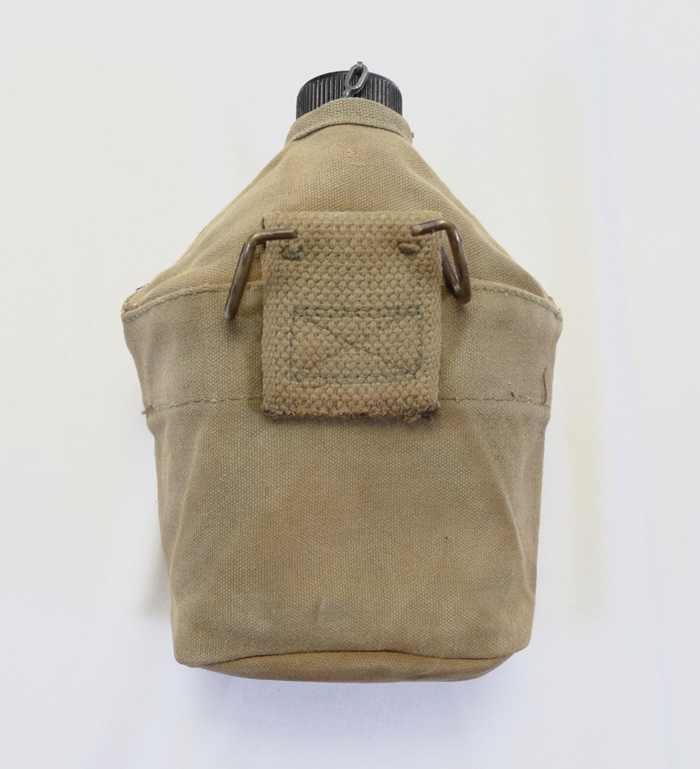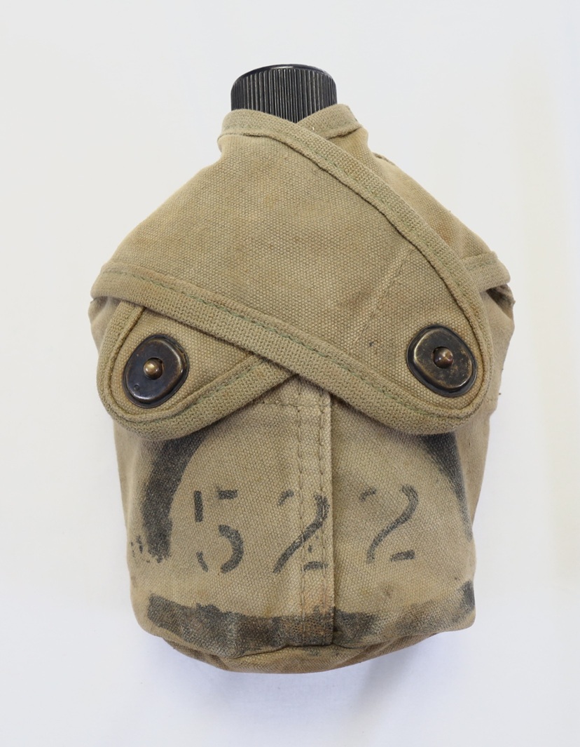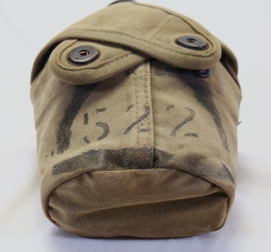 This is the standard USMC issue canteen cover with cross flaps and the M1910 canteen. The front of cover is stenciled with the 4th Marine Division UNIS symbol 522 inside a half circle. The canteen would have belonged to a private in Company E, 2nd Battalion, 25th Marine Regiment. The battalion played a critical role at Iwo Jima in the seizure of Hill 382 (Turkey Knob) in an area that Marines called “the meat grinder”. For its actions, the battalion earned a Presidential Unit Citation.